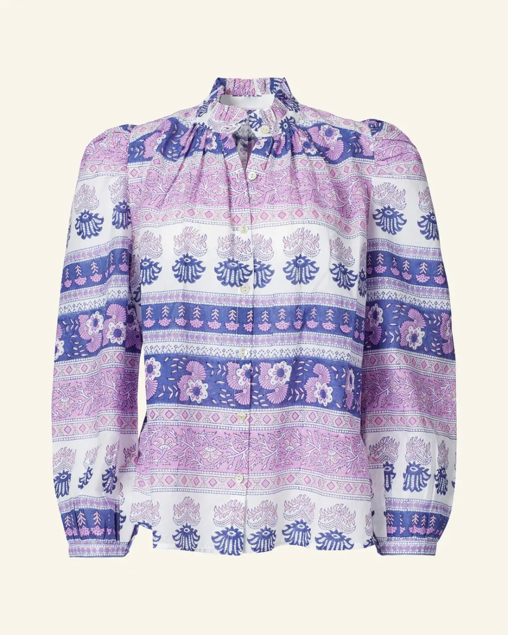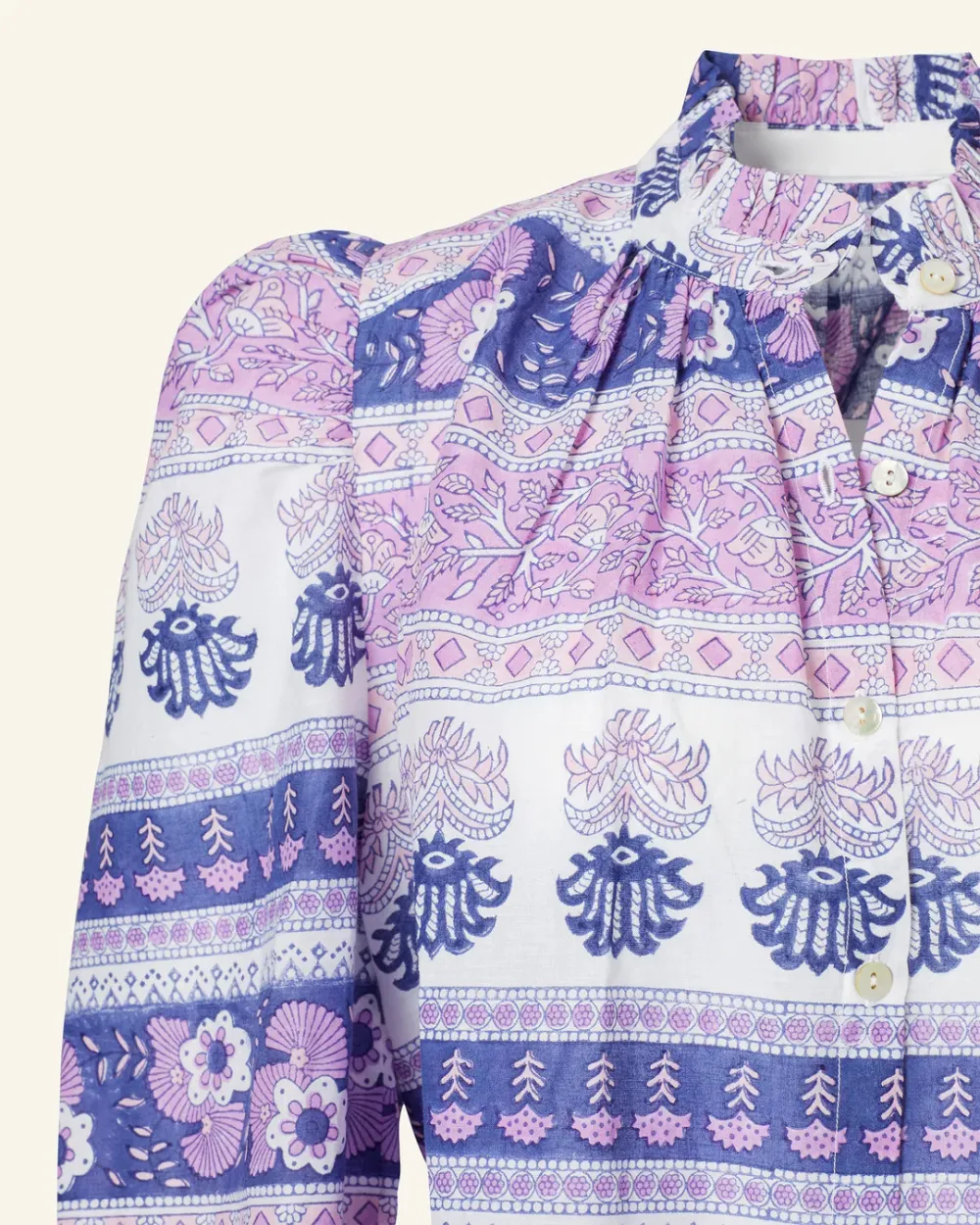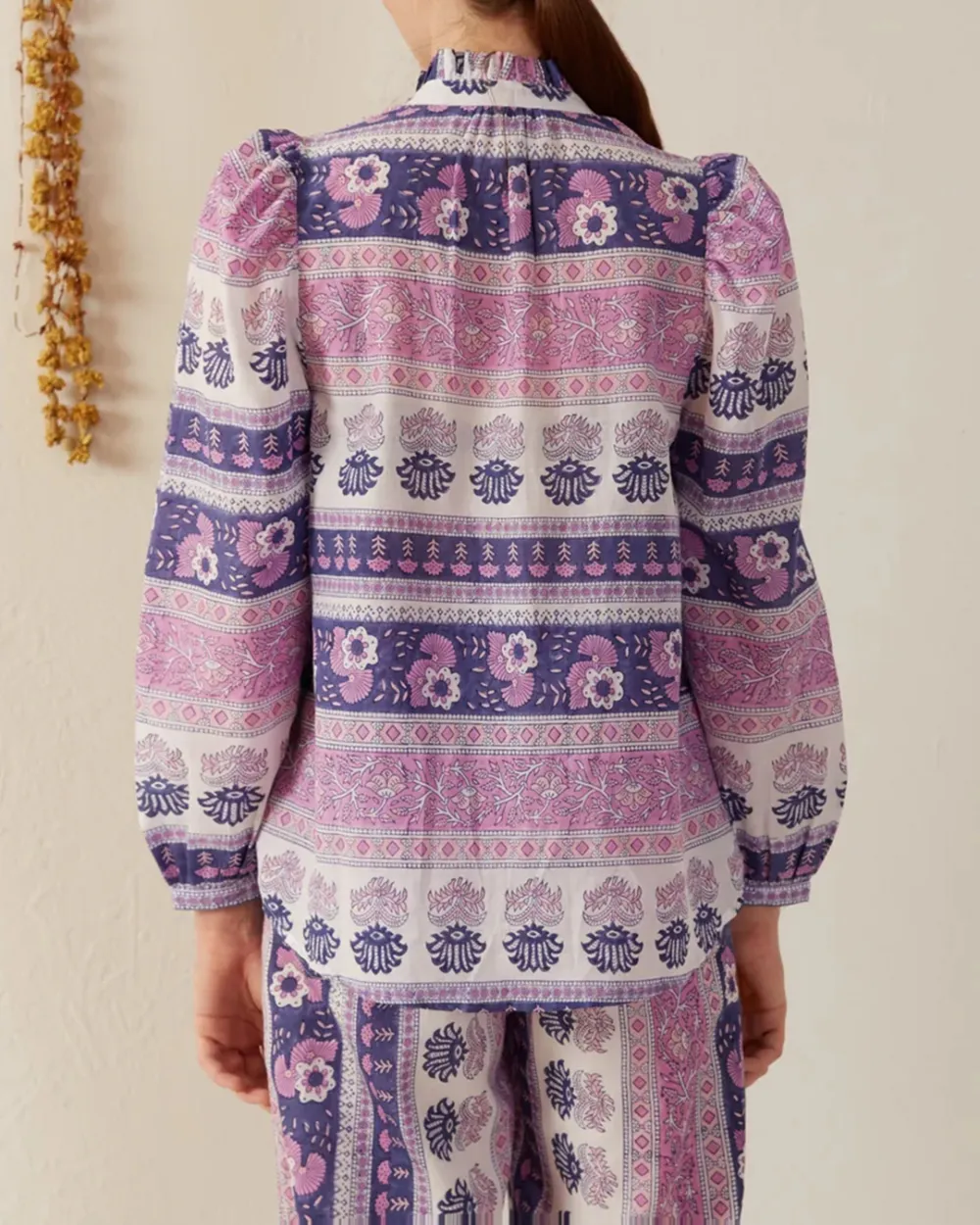 Block-printed by hand, our purple floral print shirt has long puffed sleeves and a ruffled collar. The shirt has a mother-of-pearl button front. If you love the Annabel, try the Winnie Shirt, which is the same cut with short sleeves.