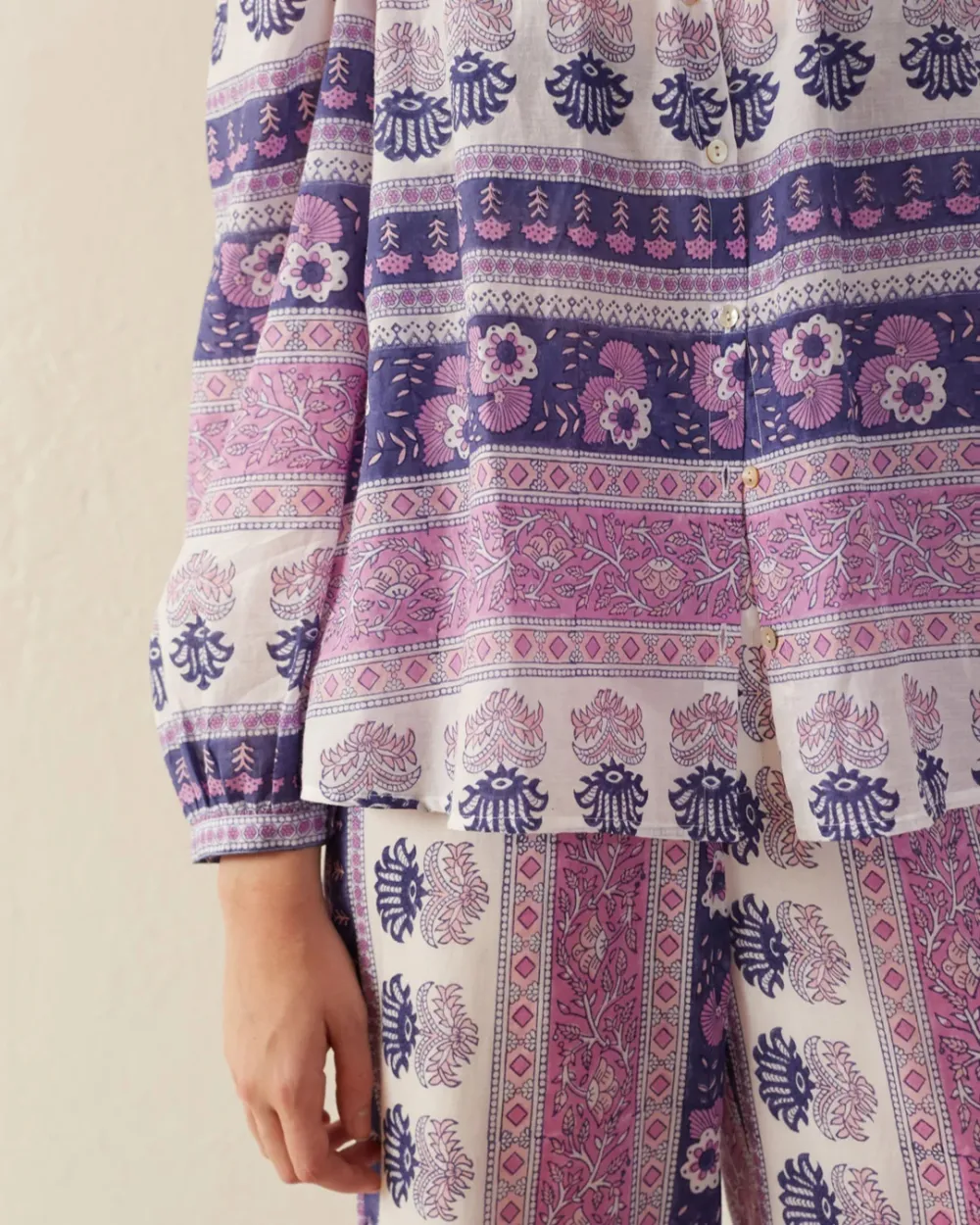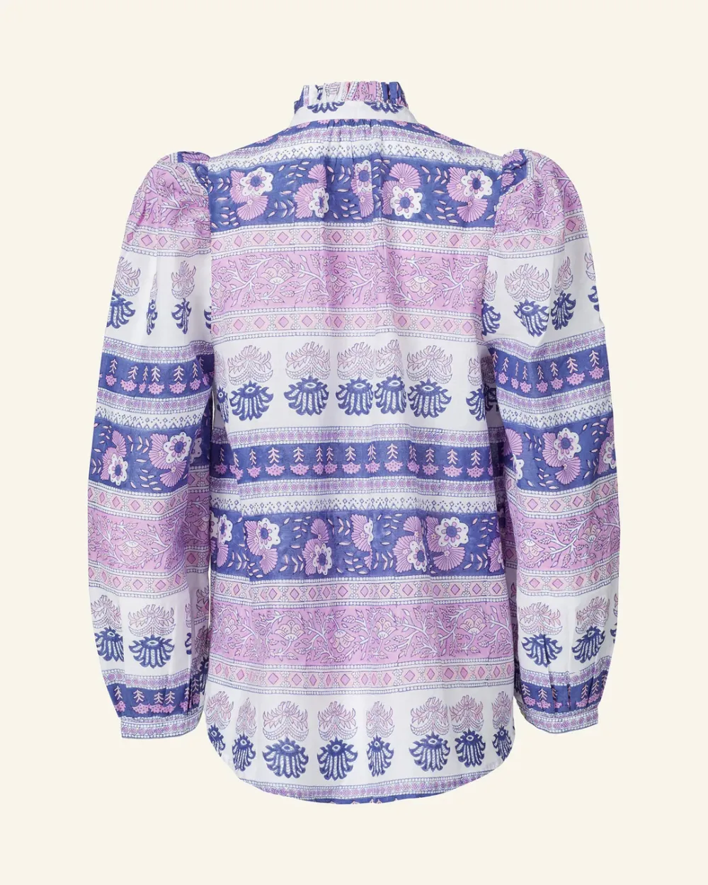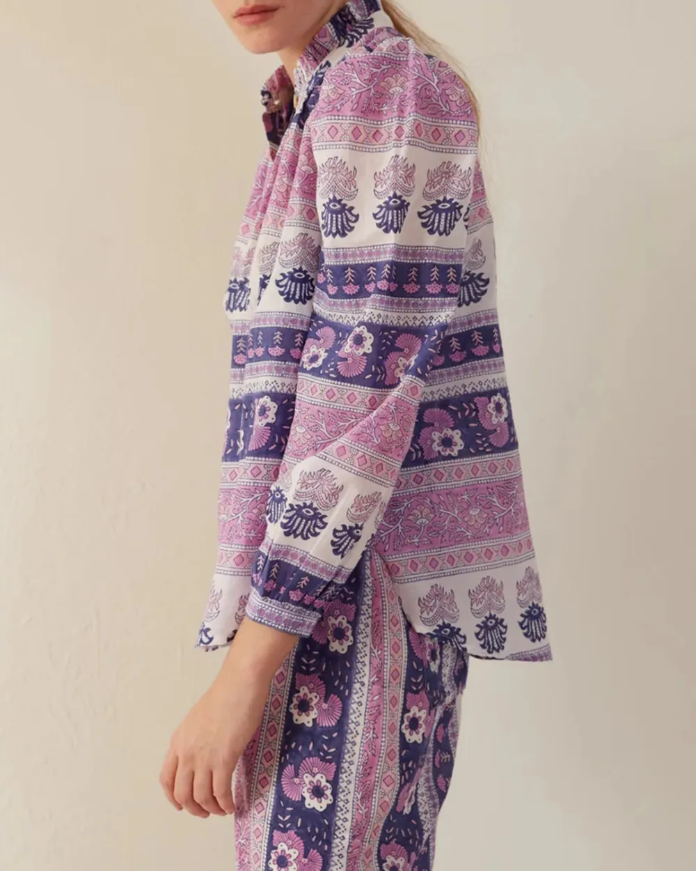 Block-printed by hand, our purple floral print shirt has long puffed sleeves and a ruffled collar. The shirt has a mother-of-pearl button front. If you love the Annabel, try the Winnie Shirt, which is the same cut with short sleeves.
