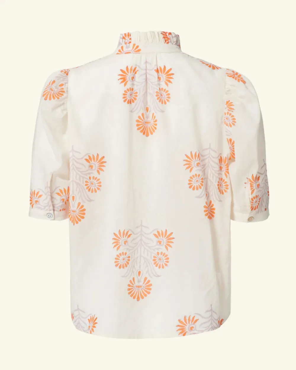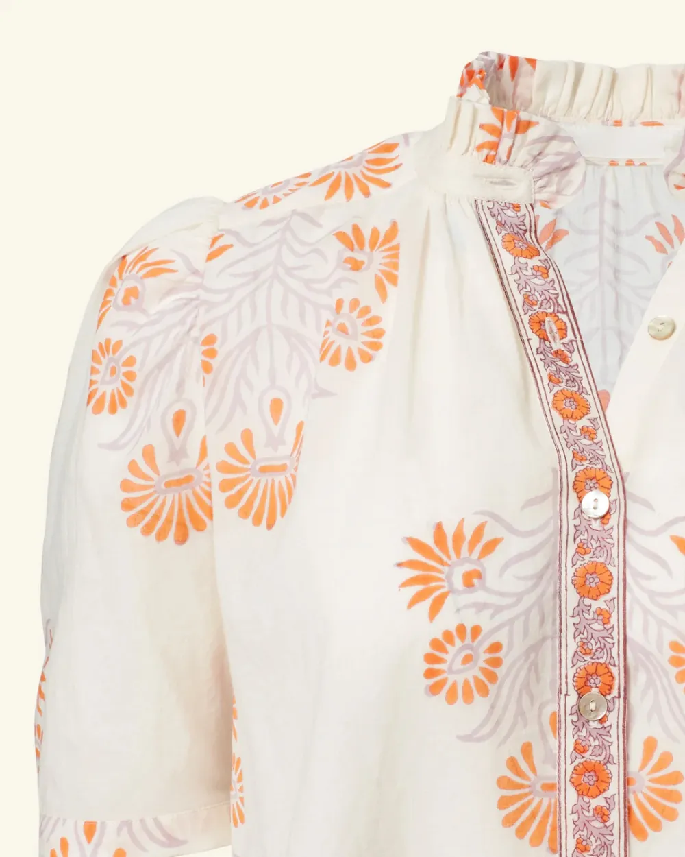 Individually cut by hand and finished with French seams, our floral motif shirt has short puffed sleeves, a ruffled collar, and a mother-of-pearl button front. Crafted from a lightweight cotton voile, the ’70s vintage-inspired shirt has a border-print button placket and a semi-sheer texture in the swaths of white.