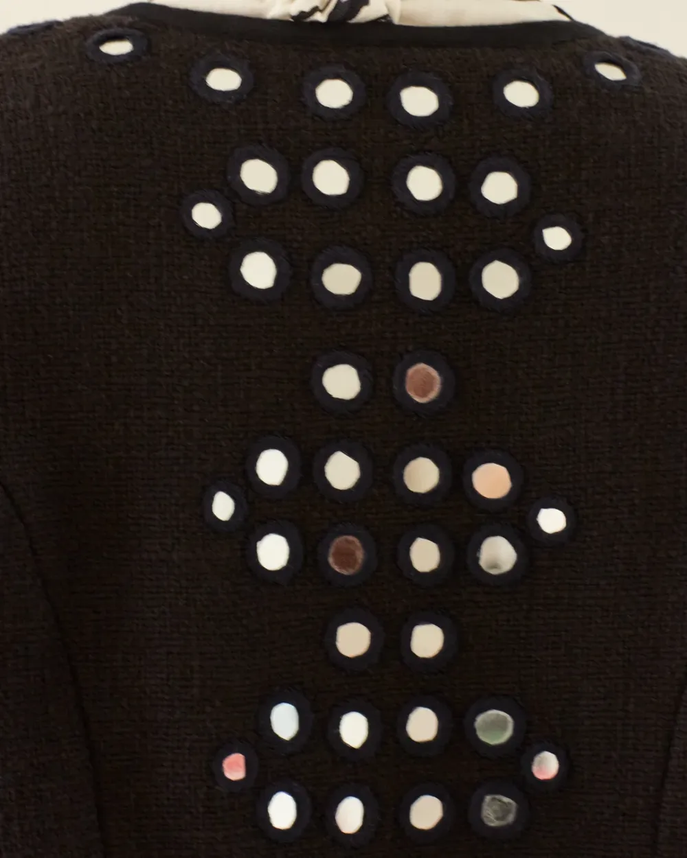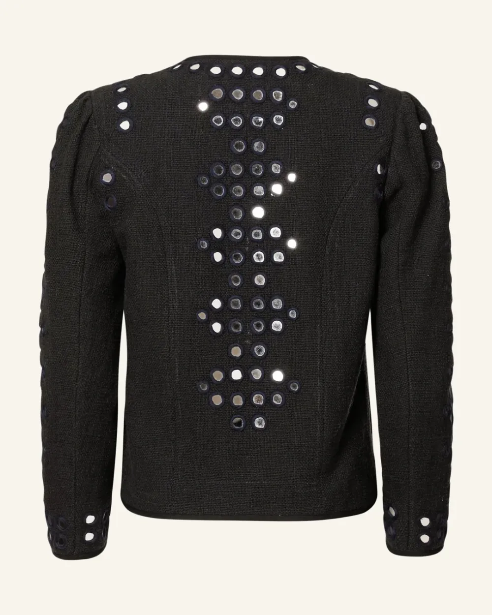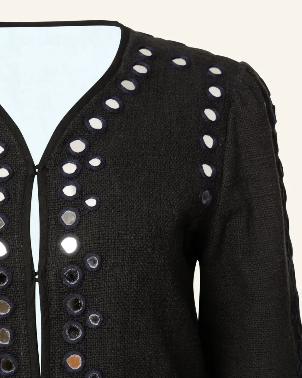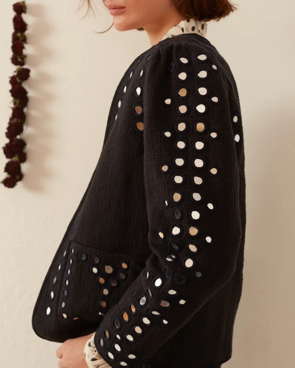 Crafted from handwoven Khadi cotton, our black embellished jacket has a classic fit. The jacket is hand-embroidered throughout with mirror work. Mirror work is the ancient craft of hand embroidering mirrors to textiles. Lined in silk, the shimmering jacket has a button and loop front closure.
