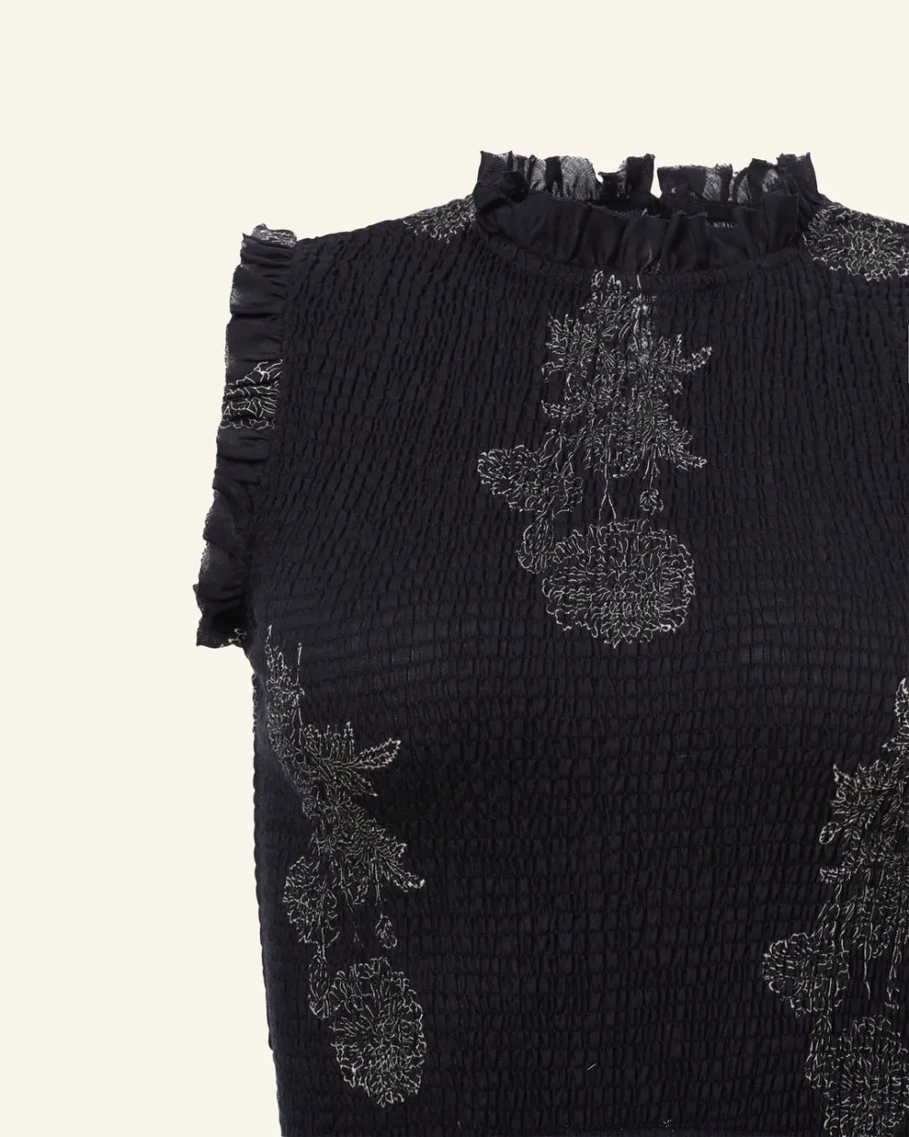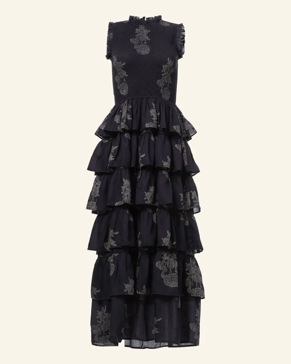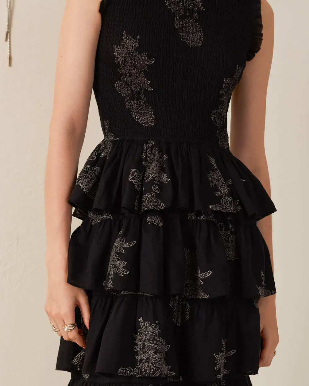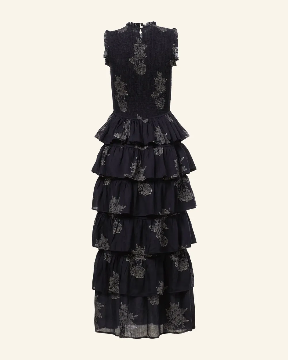 Cut from block-printed Tencel, our sleeveless floral print dress has a smocked bodice and a ruffled-tier skirt. Featuring a moody floral, the ankle-length dress has a micro ruffle trim along the neck and armholes. The perfect party dress, dress it up or down. Pairs well with a denim jacket.