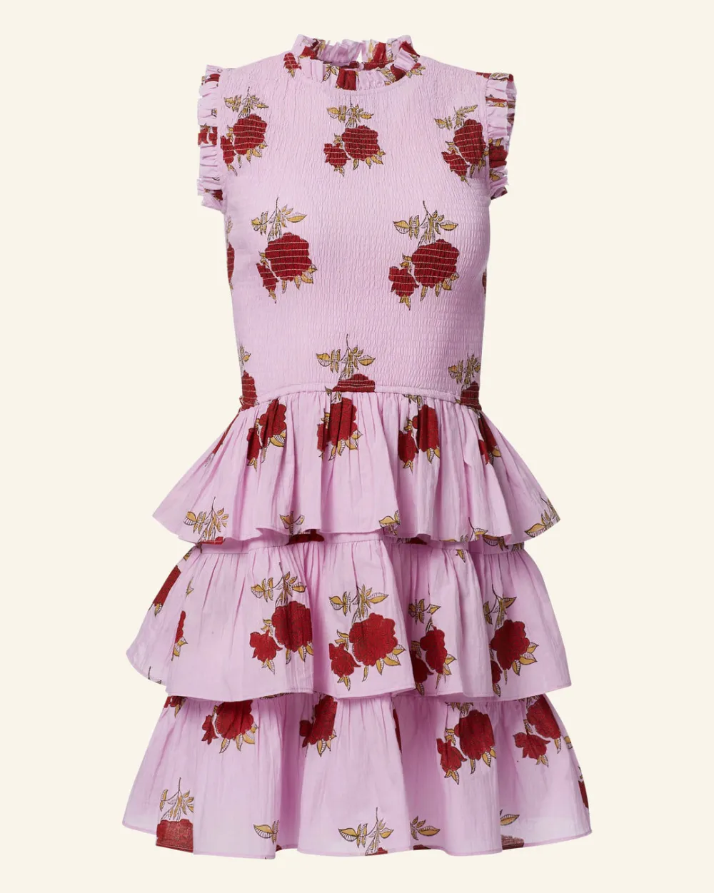 Crafted from cotton voile, our pink rose print mini dress has a smocked bodice, ruffle-tiered skirt, and micro ruffle trim along the neck and armholes. The hand-finished dress is hand-block printed with a floral motif inspired by French chintz.
