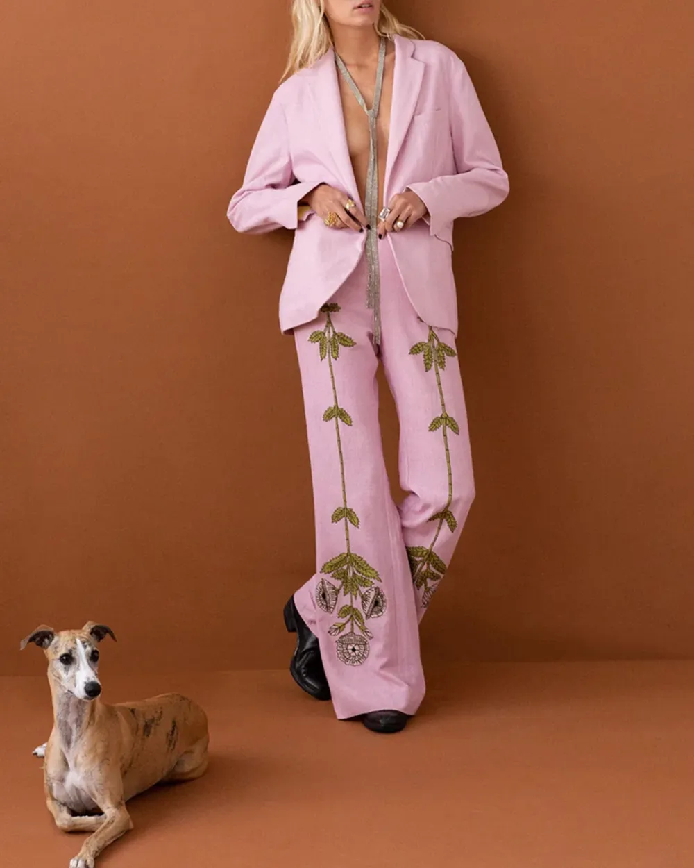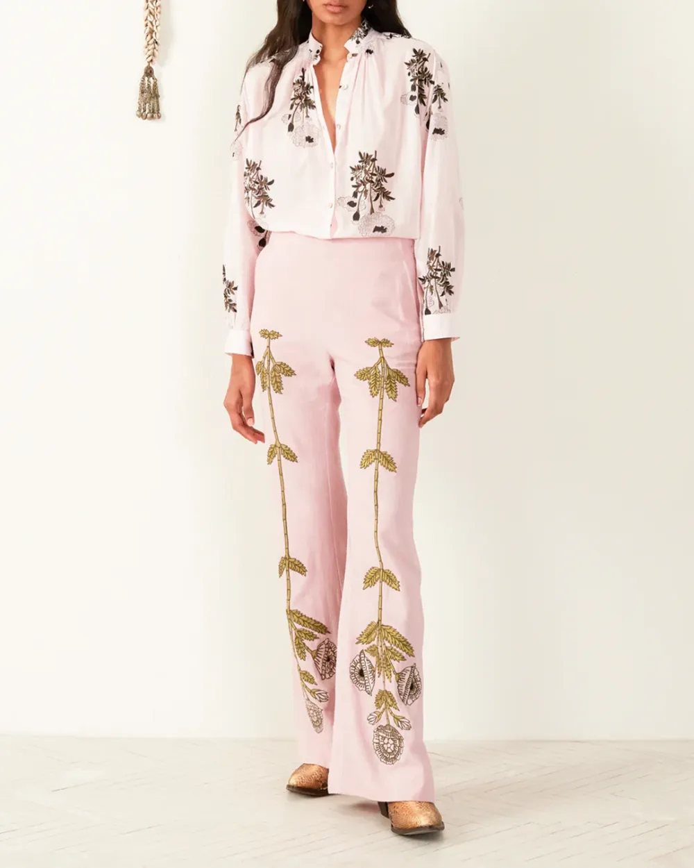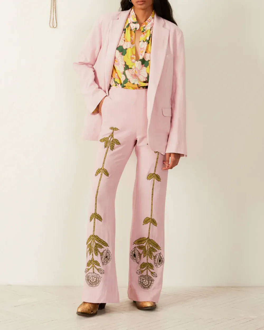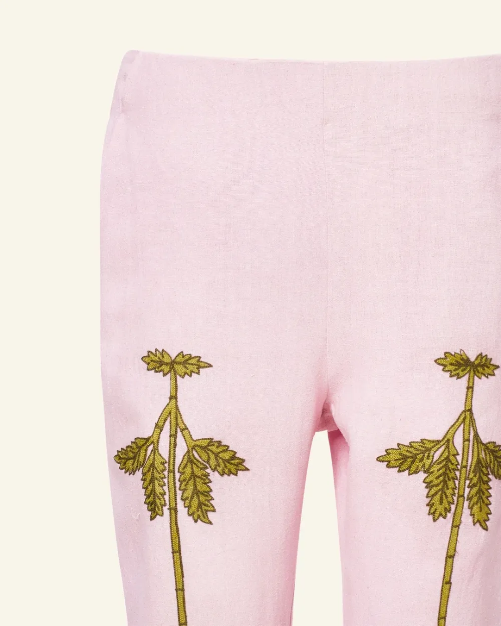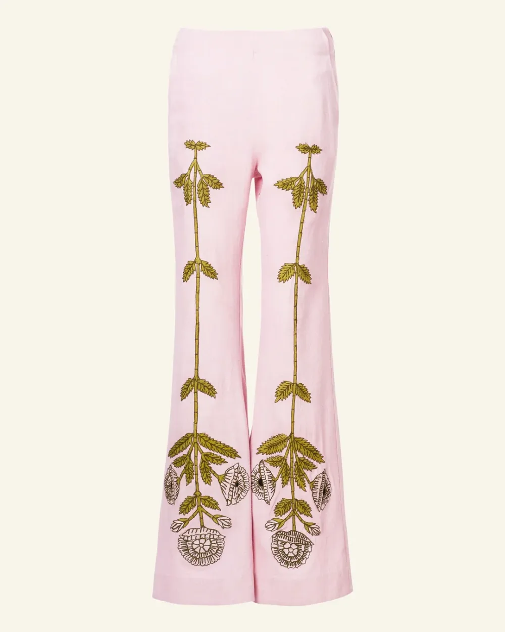 Crafted from handwoven slub silk, our peony pink pant is hand-embroidered with a symmetrical floral motif along the legs. The silk pant is slim through the hip with a lightly flared leg. The ’70s style pant is finished with French seams.