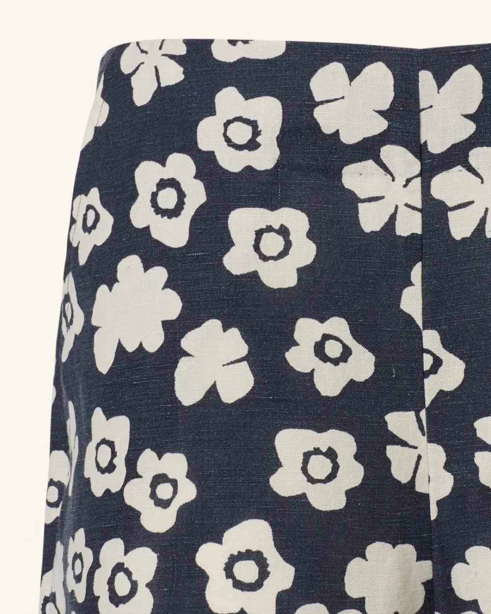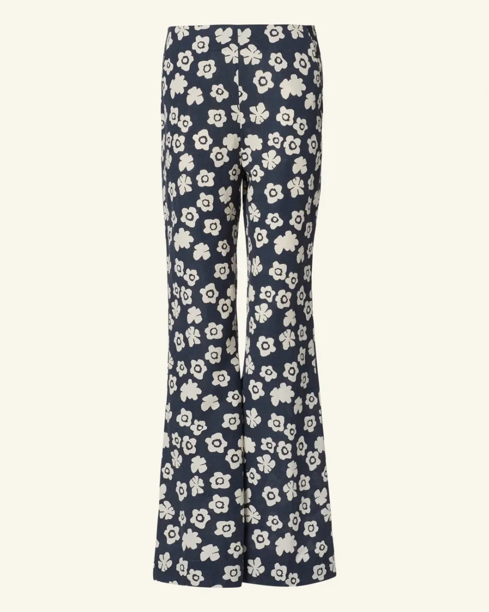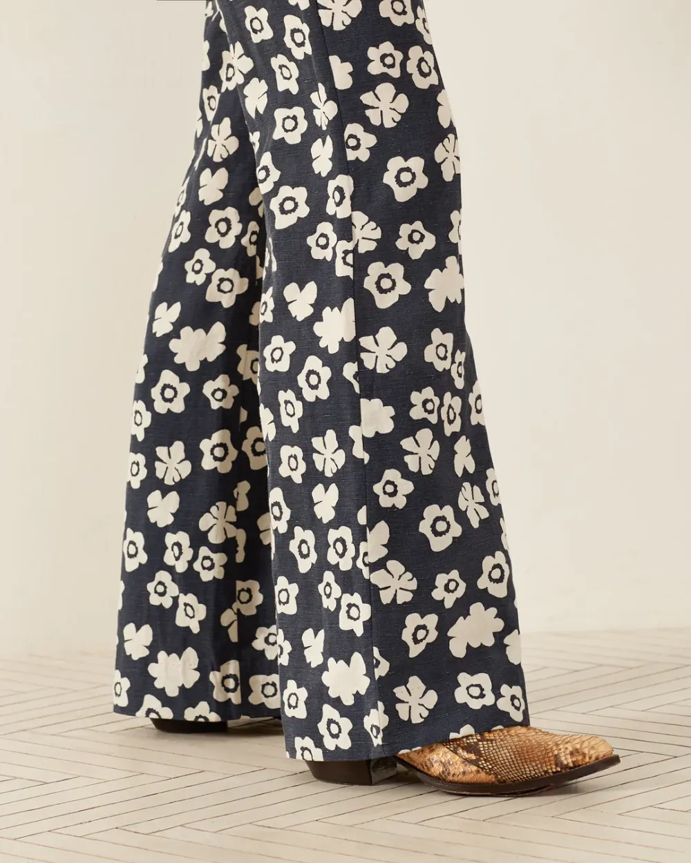 Featuring a fun retro floral print, our navy cotton pant is slim through the hip with a lightly flared leg and side zipper. The hand-finished pant has a vintage-inspired feel. Pairs well with our prints and textures.