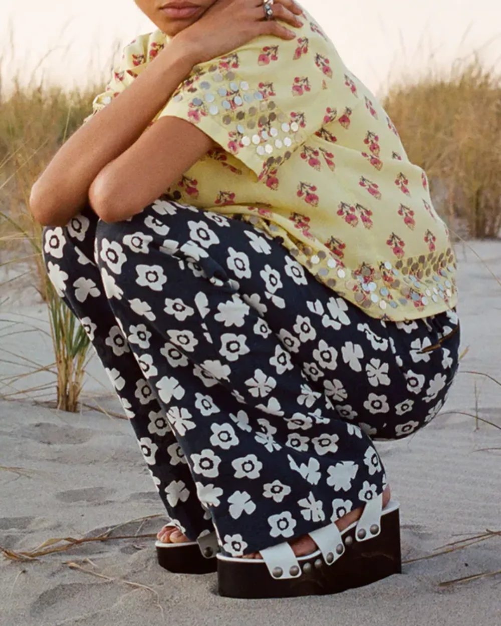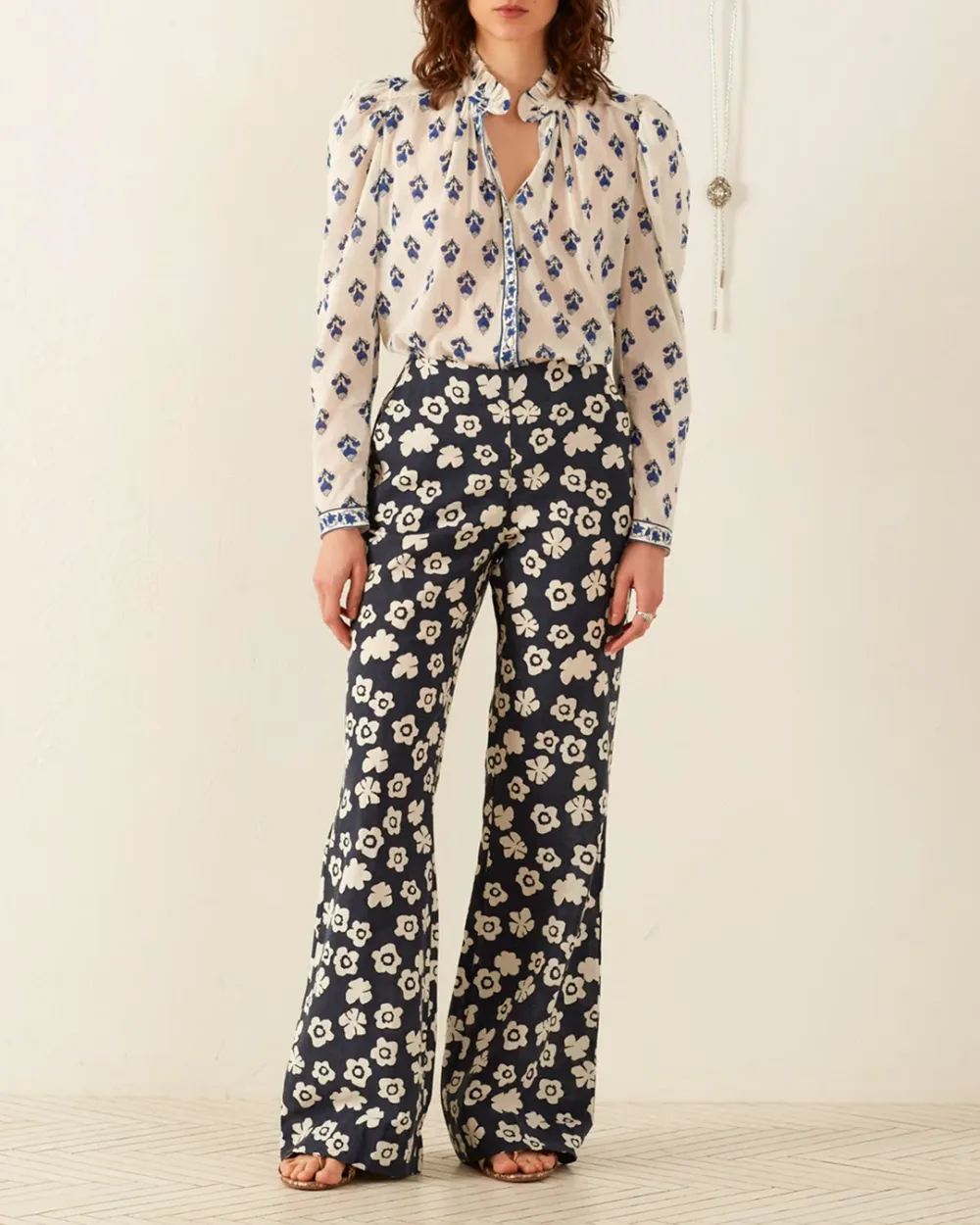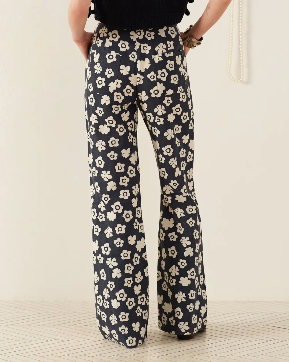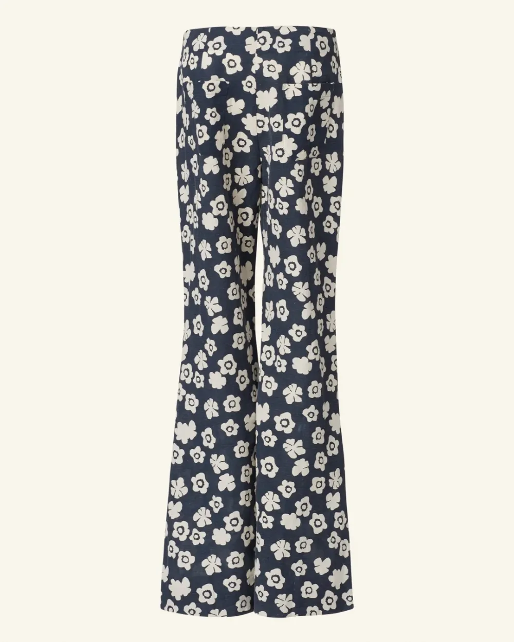 Featuring a fun retro floral print, our navy cotton pant is slim through the hip with a lightly flared leg and side zipper. The hand-finished pant has a vintage-inspired feel. Pairs well with our prints and textures.