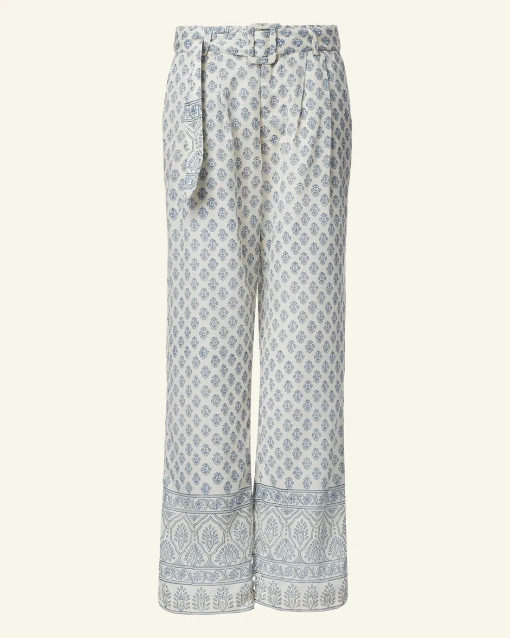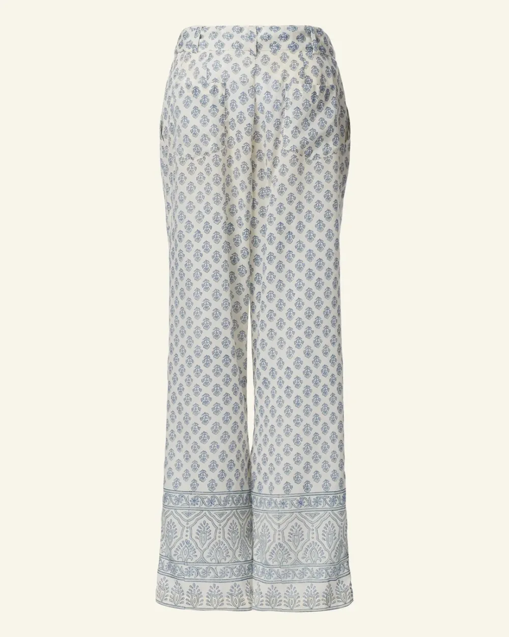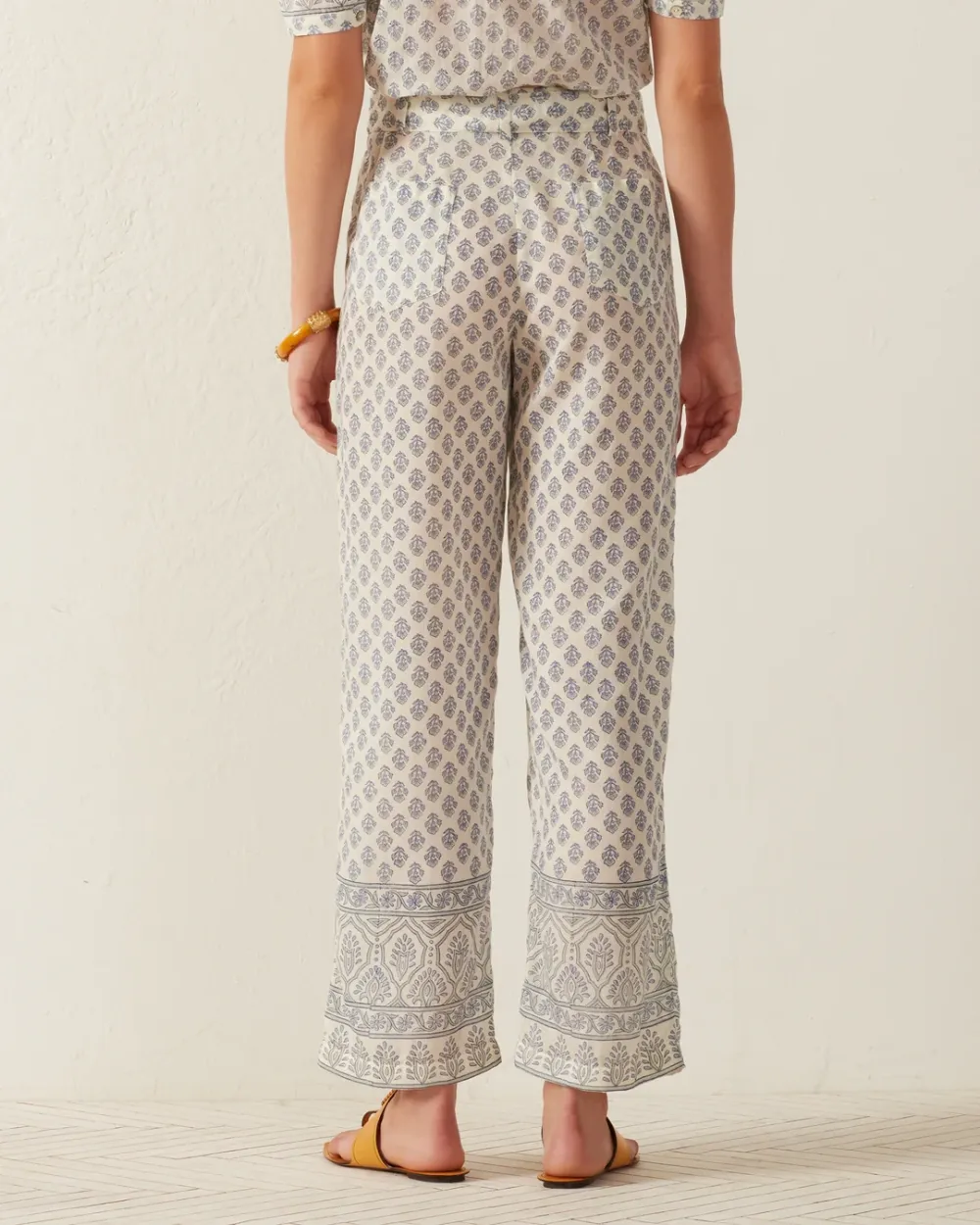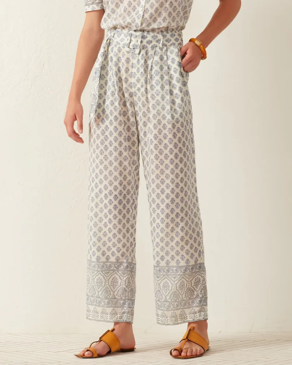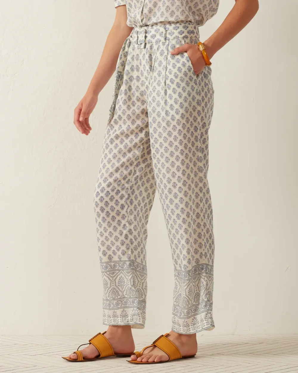 Crafted from Tencel and finished with French seams, our blue floral motif high-waisted pant is lightly pleated with a straight leg silhouette and zip fly closure. The ankle pant is hand-block printed with a Provençal-style print. The soft summer pant has a vintage-inspired feel.