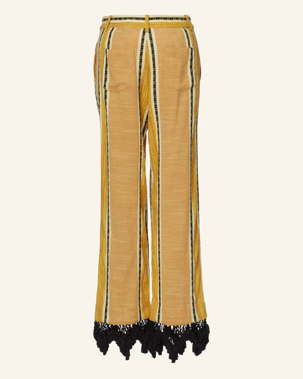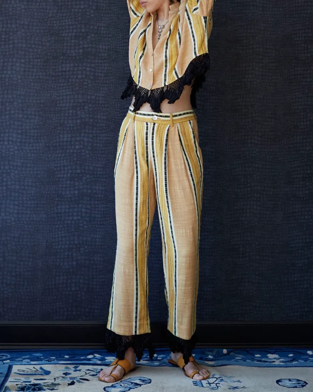 Crafted from hand-loomed cotton, our striped yellow high-waisted pant is lightly pleated with a straight leg silhouette. Trimmed with black cotton fringe like a vintage beach parasol, the summery ankle pant has a seaside feel.
