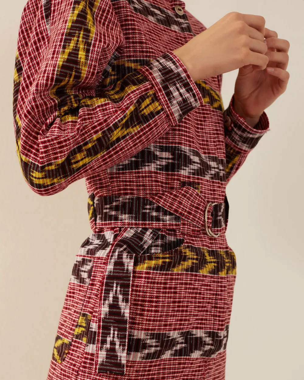 Crafted from hand-woven Guatemalan ikat, our red mini dress has long sleeves and an adjustable D-ring belt. The cotton dress has a covered-button placket and curved inset pockets. Pair it with boots.