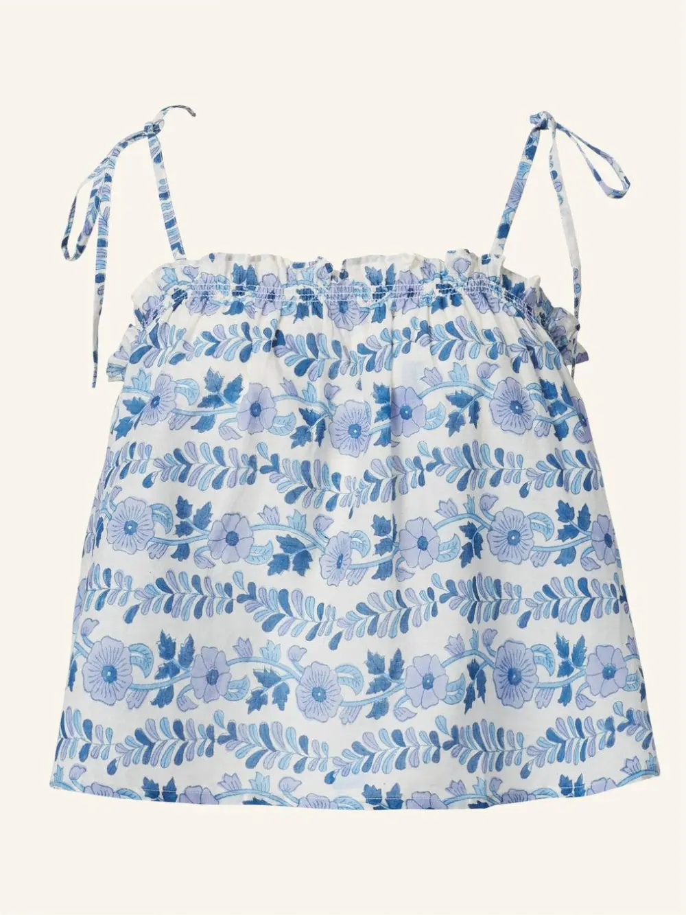 Crafted from a lightweight cotton voile, our blue-and-white floral print sleeveless top has light smocking at the bust, adjustable tie straps, and a loose fit. The vintage-inspired cropped top is hand-block printed with a ’60s-style floral motif.