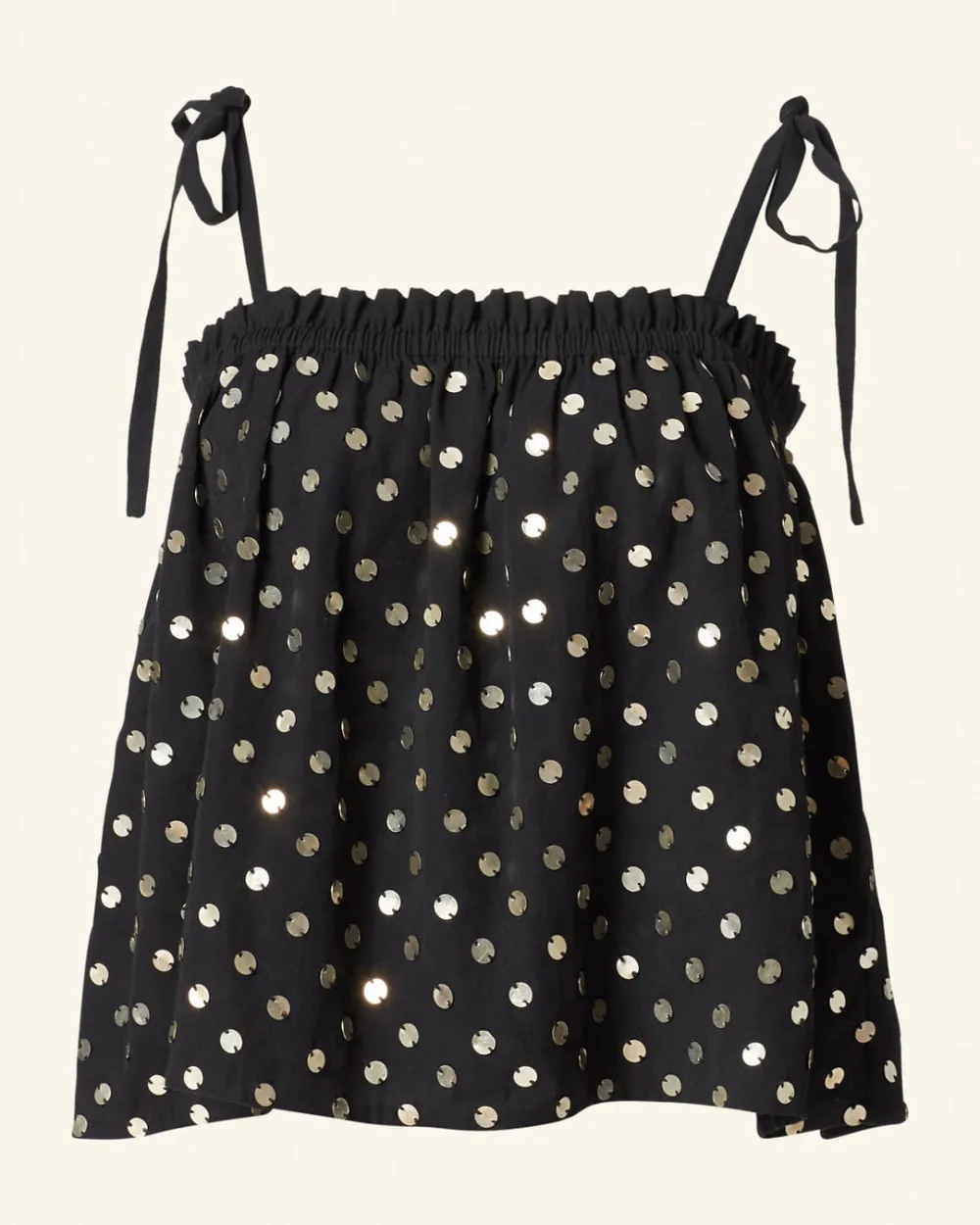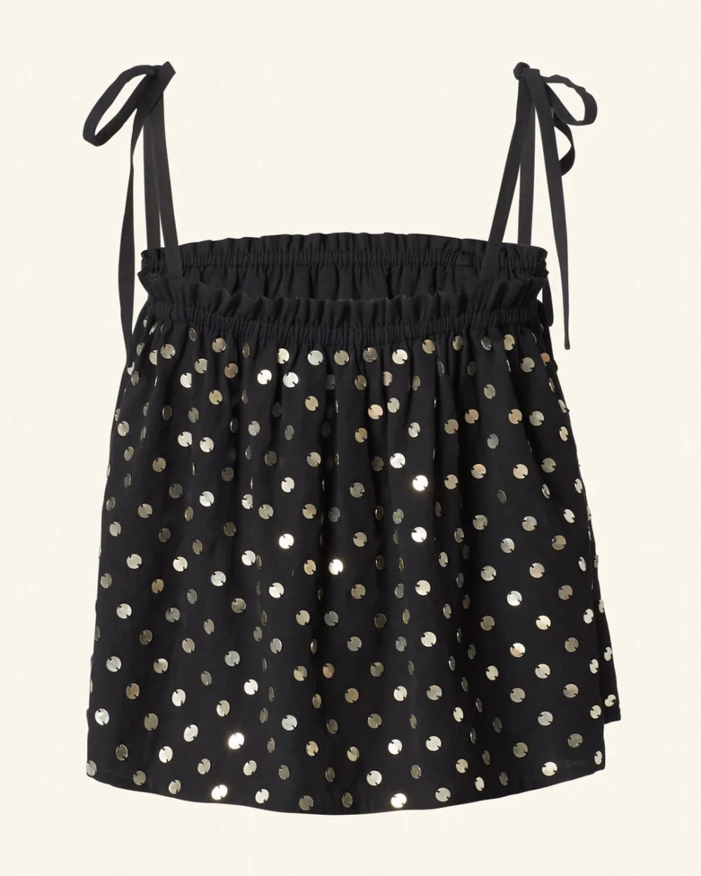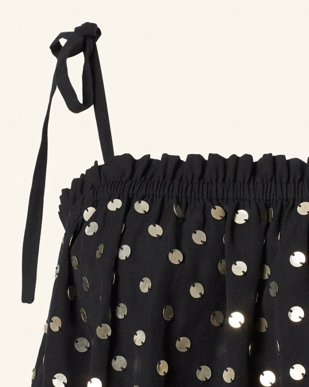 Like bioluminescence sparkling on the darkened sea, our polka-dot sleeveless is hand-embellished with hundreds of silver metal sequins. Crafted from Tencel, the vintage-inspired top has light smocking at the bust and adjustable tie straps. The embellished top can easily go from day to evening.