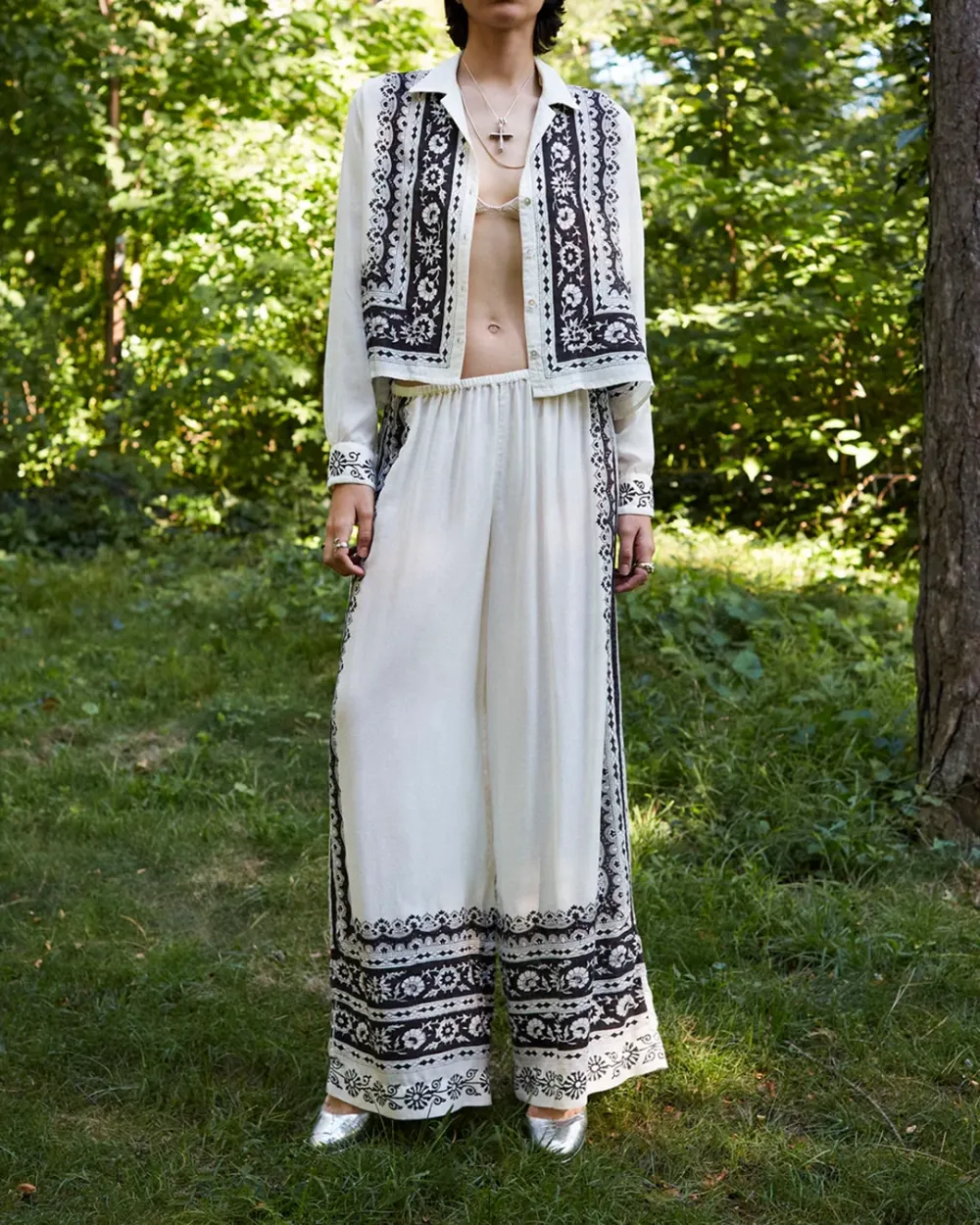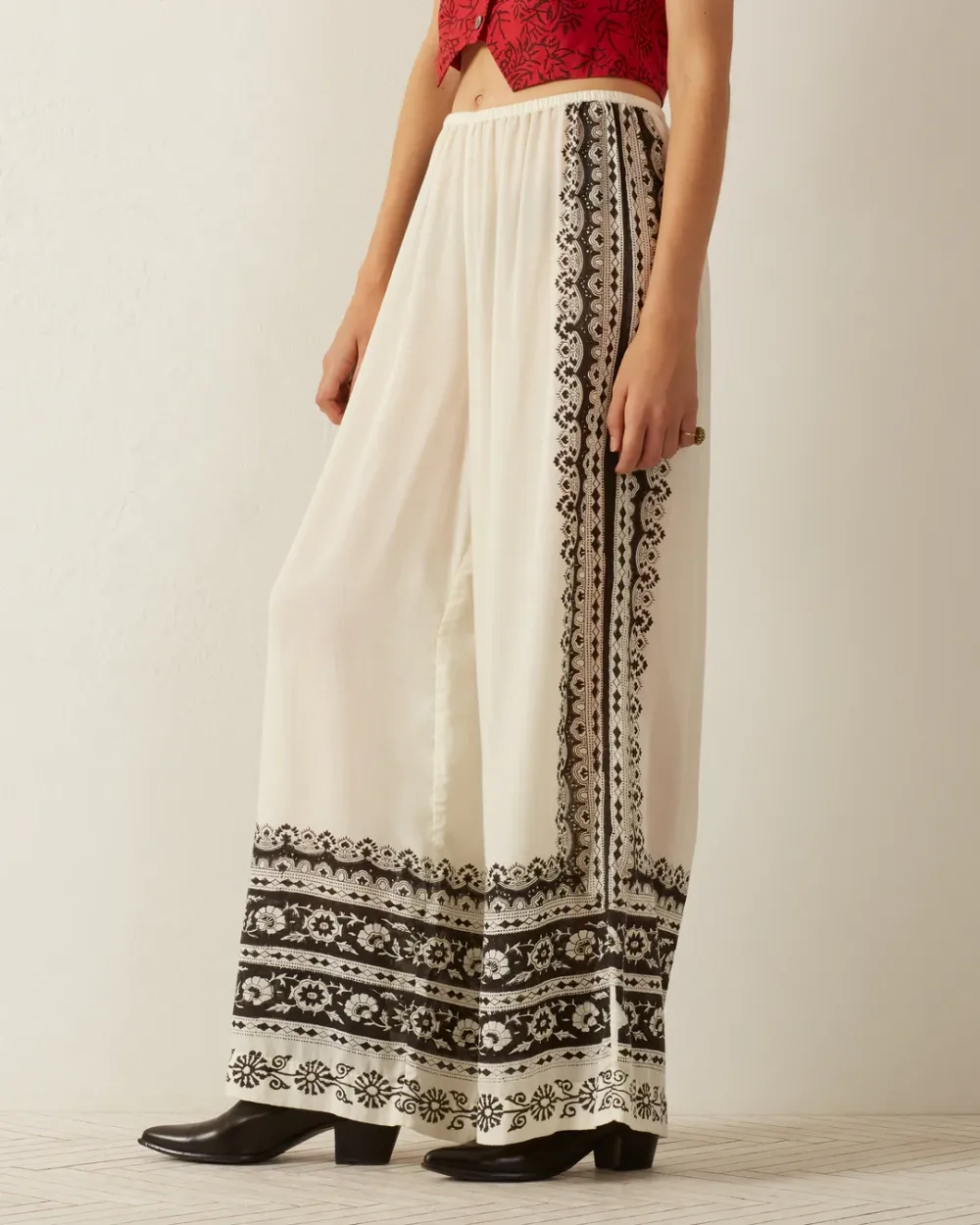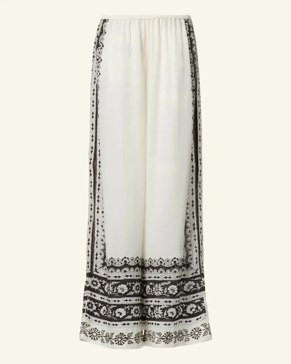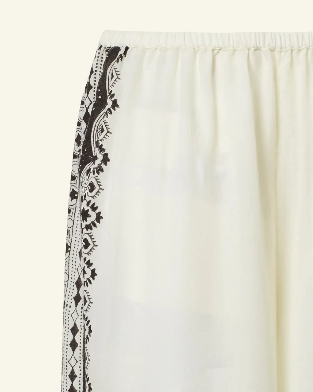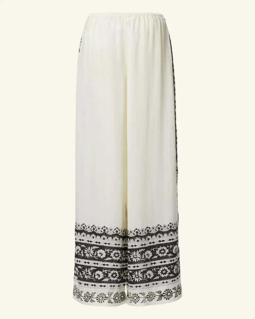 Crafted from Tencel, our ivory pant has an easy fit and a wide-leg silhouette. Hand-block printed with decorative border print, the soft billowy pant has an elasticated waist and a beautiful drape.