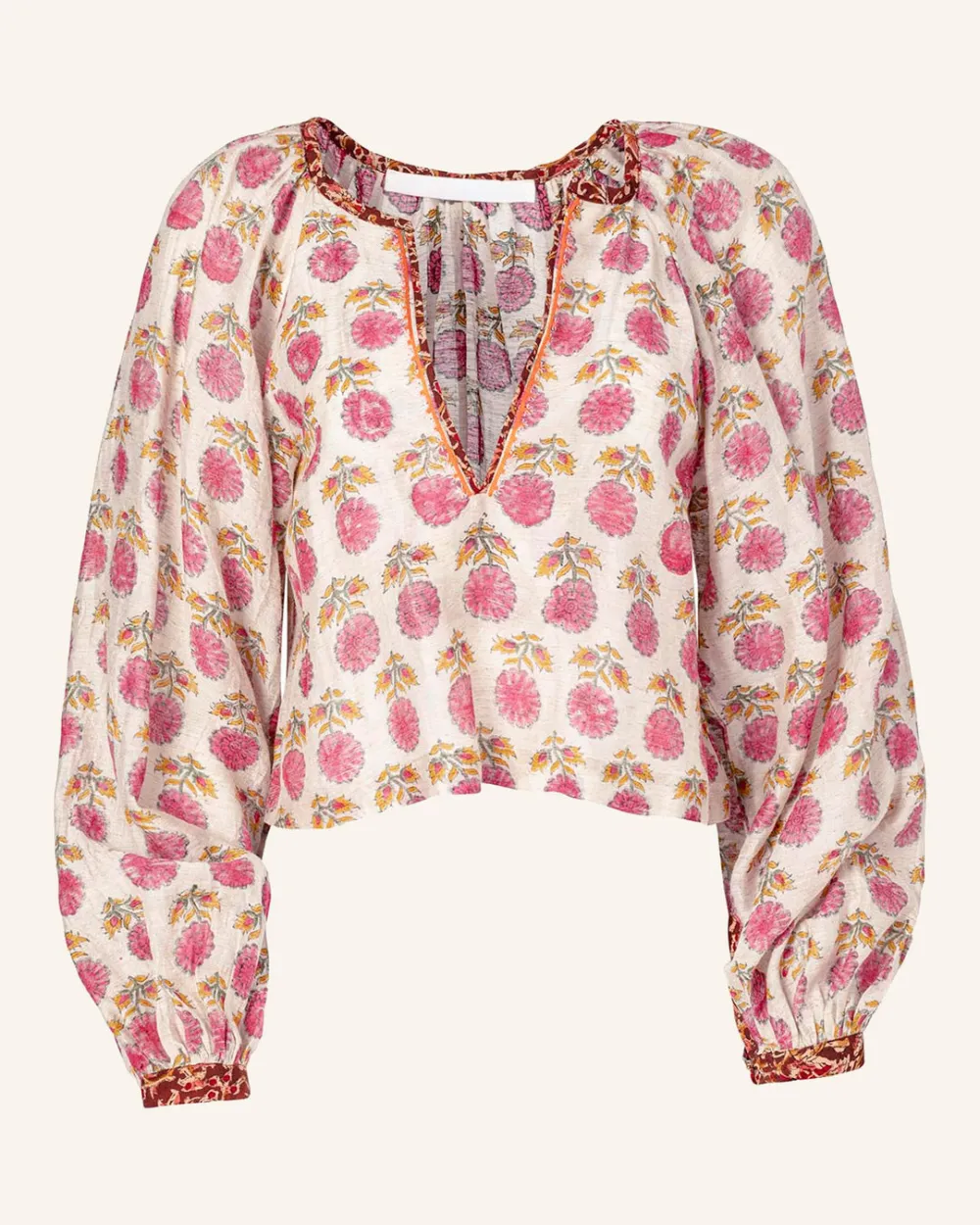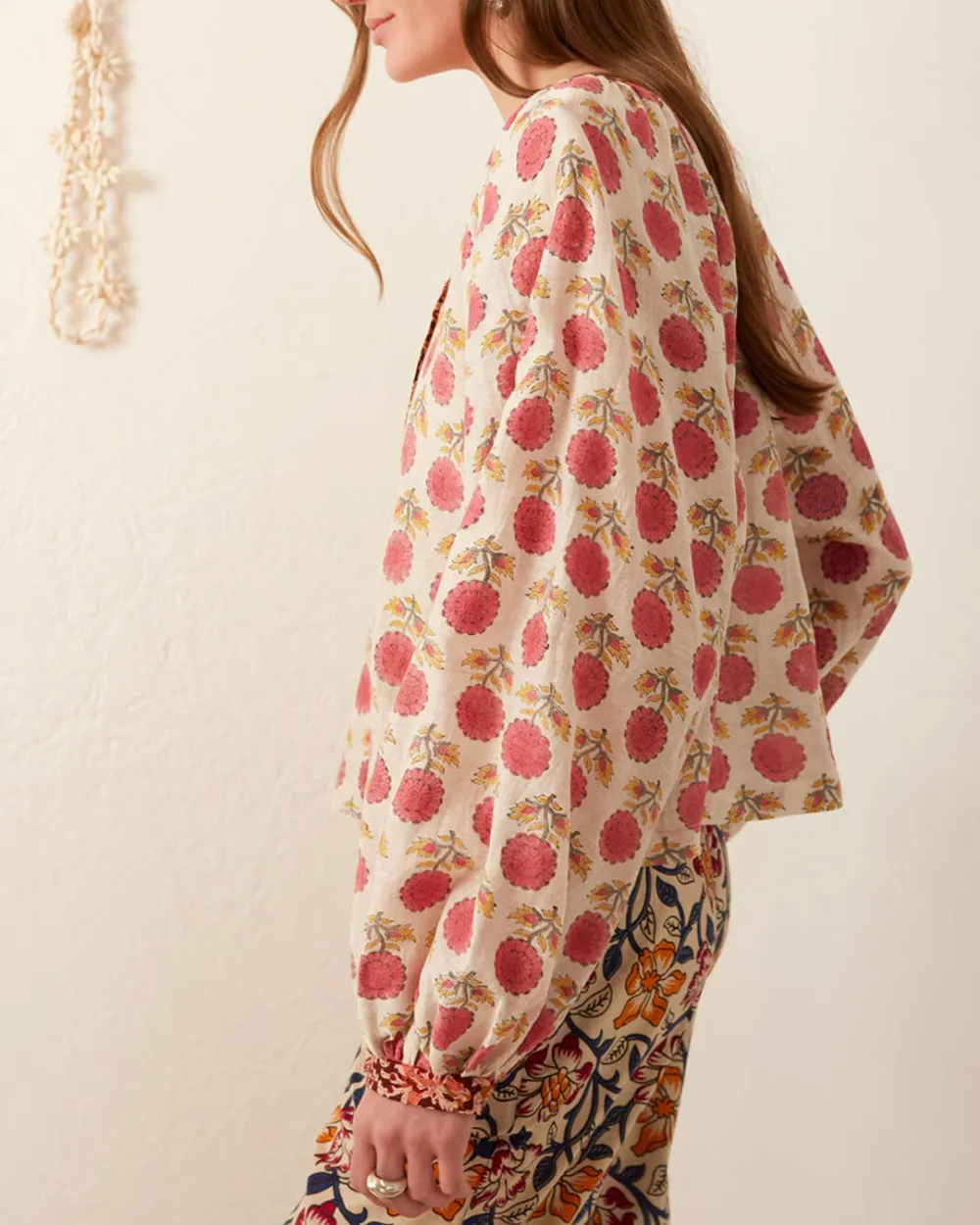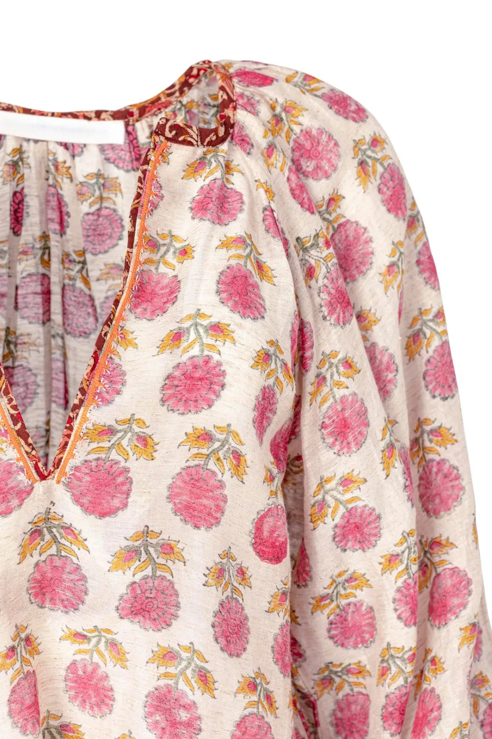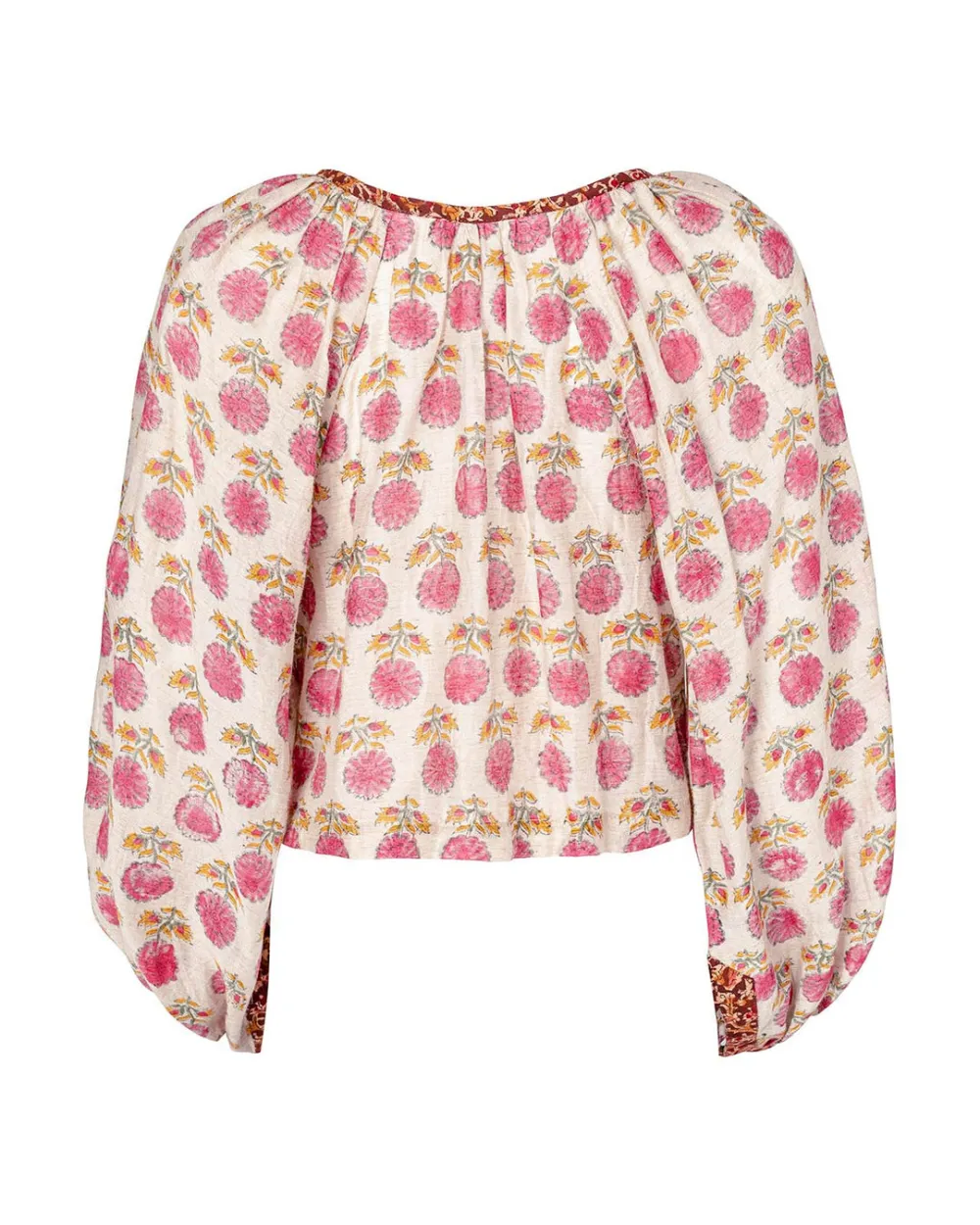 Rendered in hand printed Chanderi silk, the Marlowe Top is gathered and cropped, with contrasting binding at the neck and cuff, front opening decorated with hand embroidery.