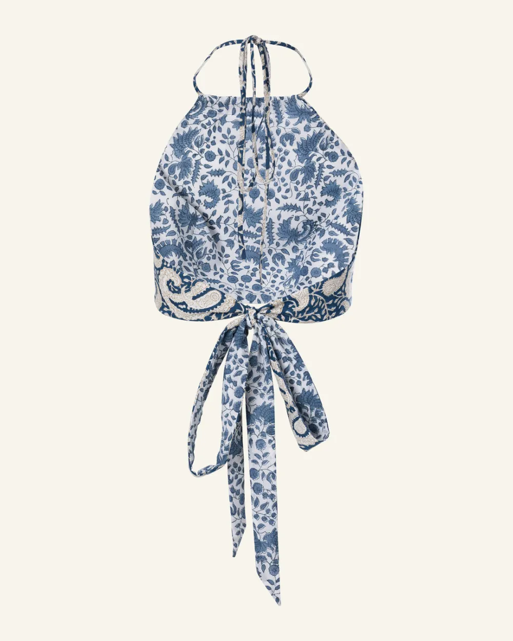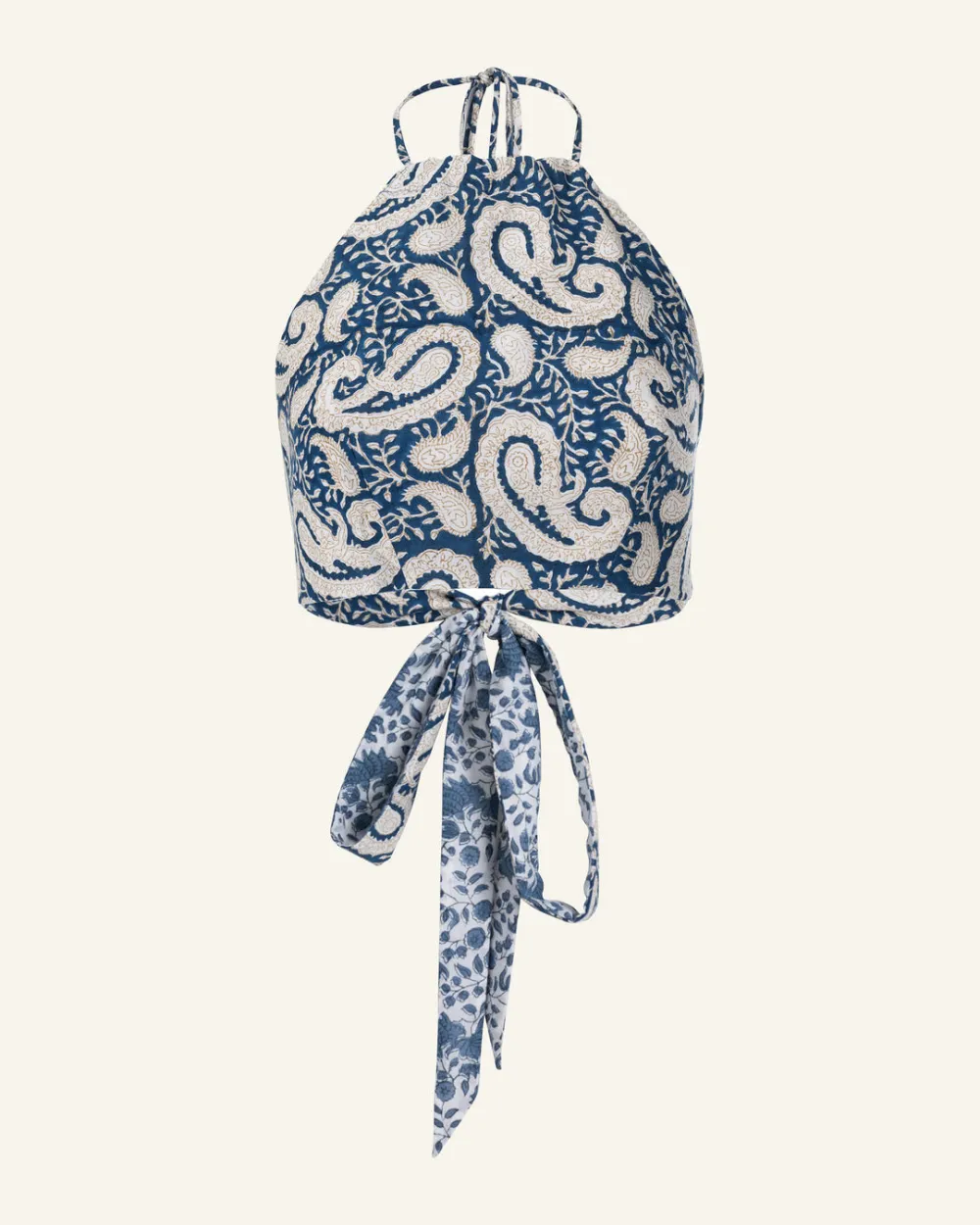 Cut from block-printed cotton, our blue paisley print halter ties at the neck and back. Lined with a contrasting floral pattern, the top is fully reversible. A great option for when you need to pack light, but want an extra look.