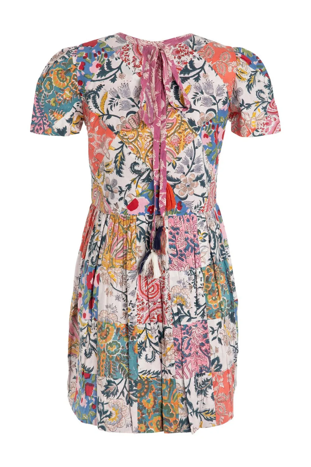 Round neck mini dress rendered in hand quilted up-cycled fabrics, with a tie closure at the back of the neck. Dress can also be worn back to front.