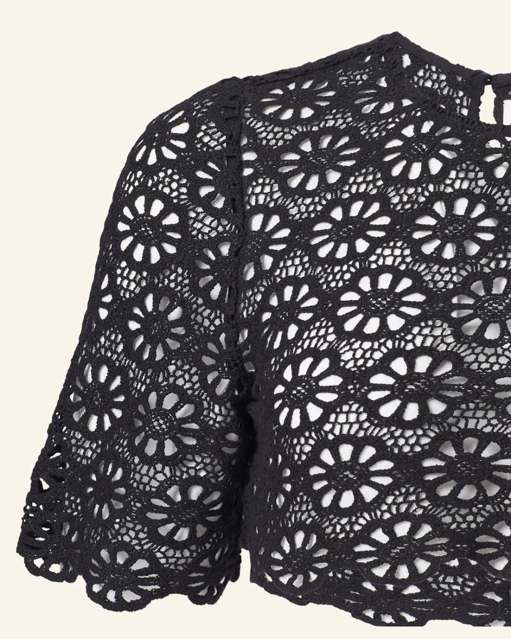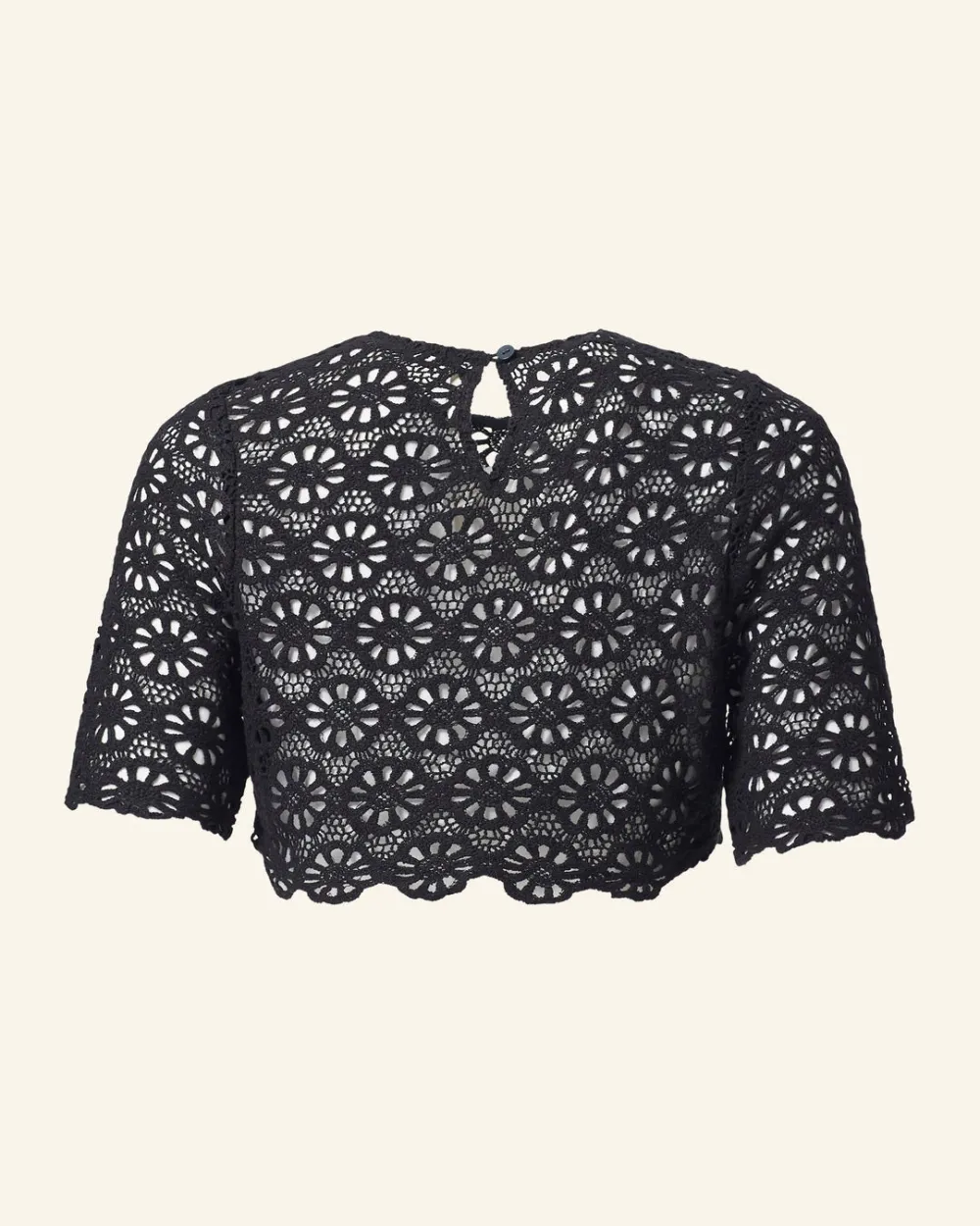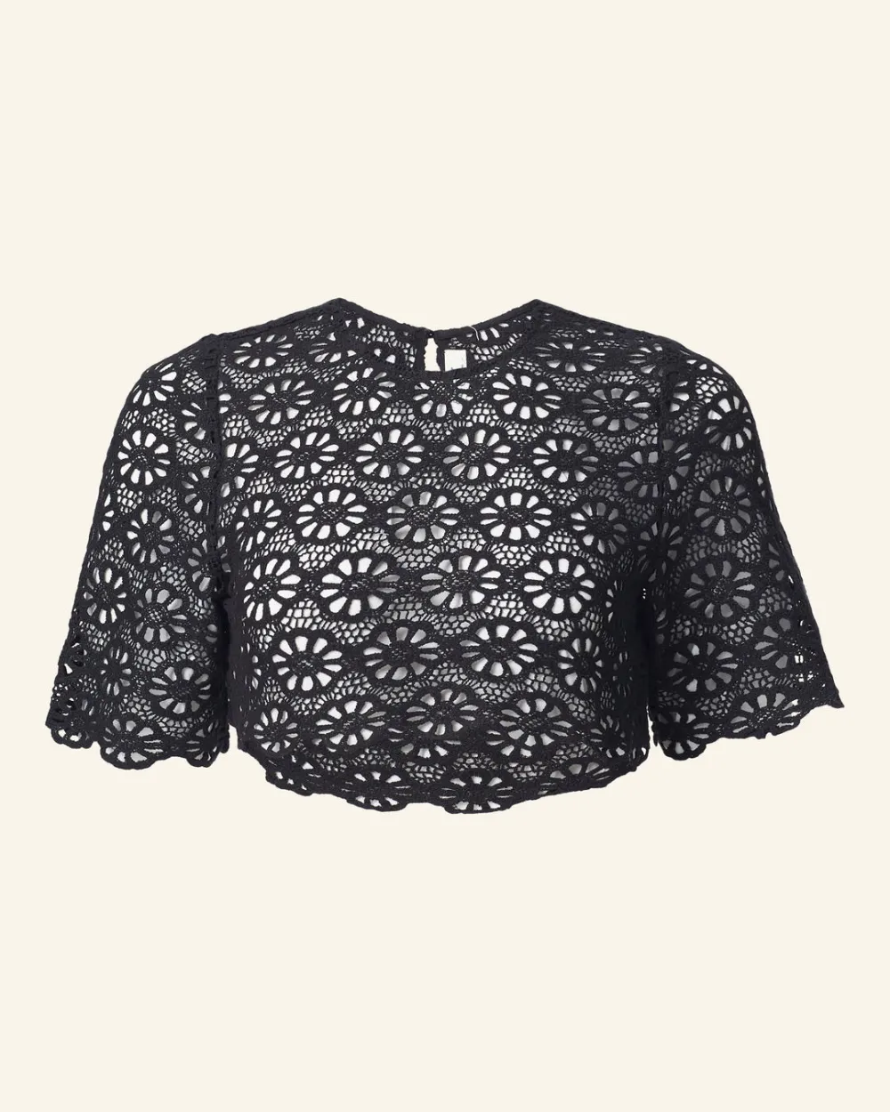 Cut by hand, our ivory eyelet tunic has dropped shoulders, gathered cuffs, and an oversized collar. The vintage-inspired cotton top has handworked fagoting on the seams. Works well as a textural beach cover-up.