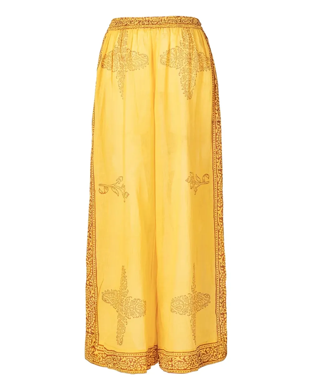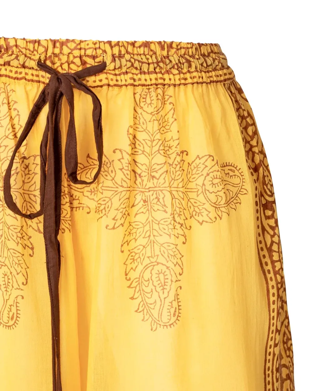 Rendered in block-printed cotton voile, our arabesque print pant has a wide-leg silhouette and an elasticized drawstring waist finished with cowrie shells and tassels. The lightweight pant has a semi-sheer texture that is great for warmer weather.