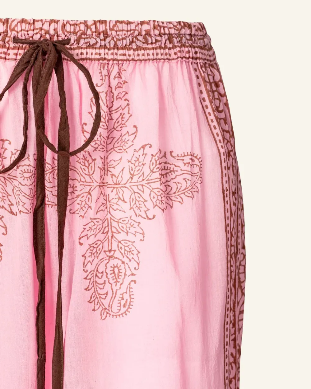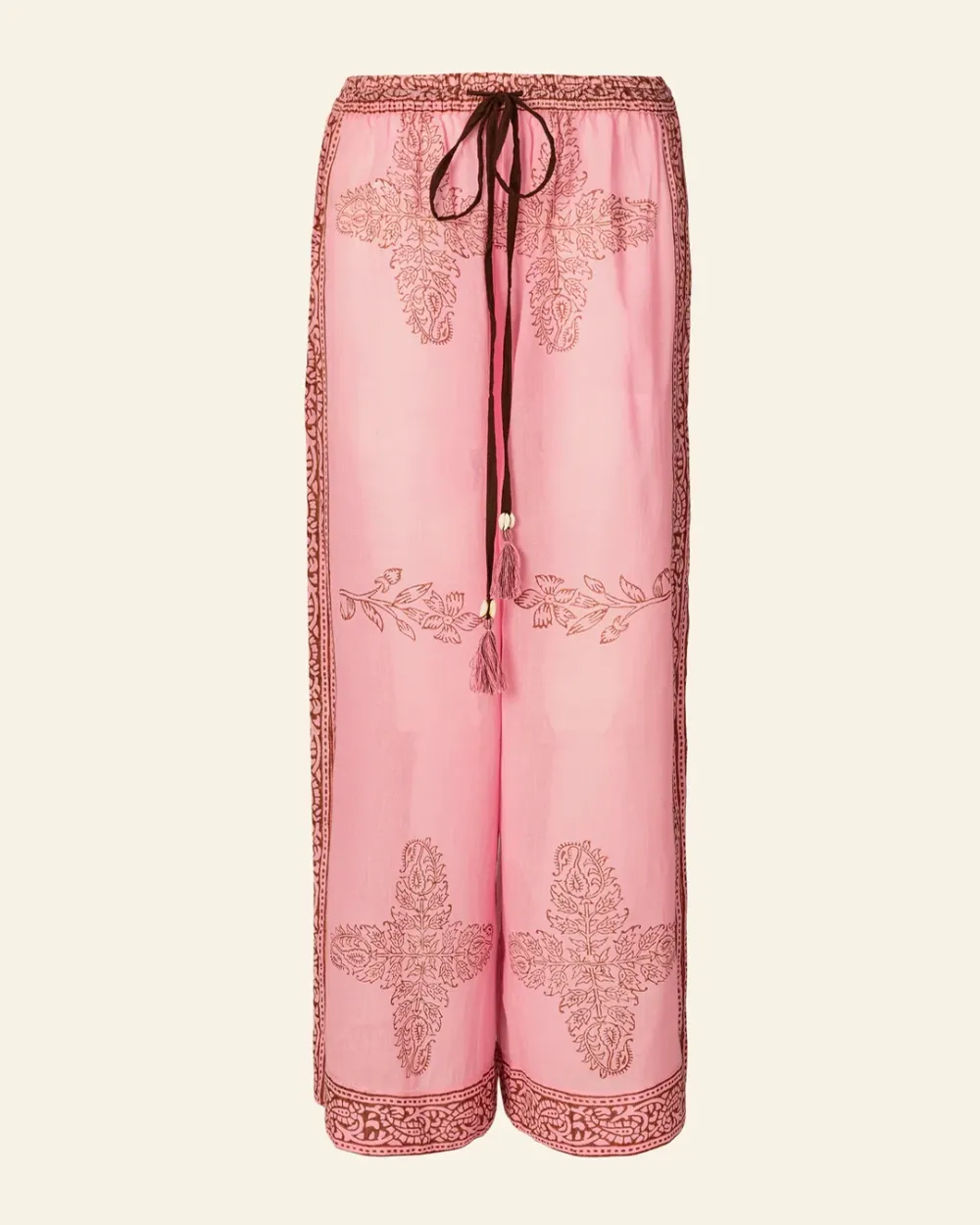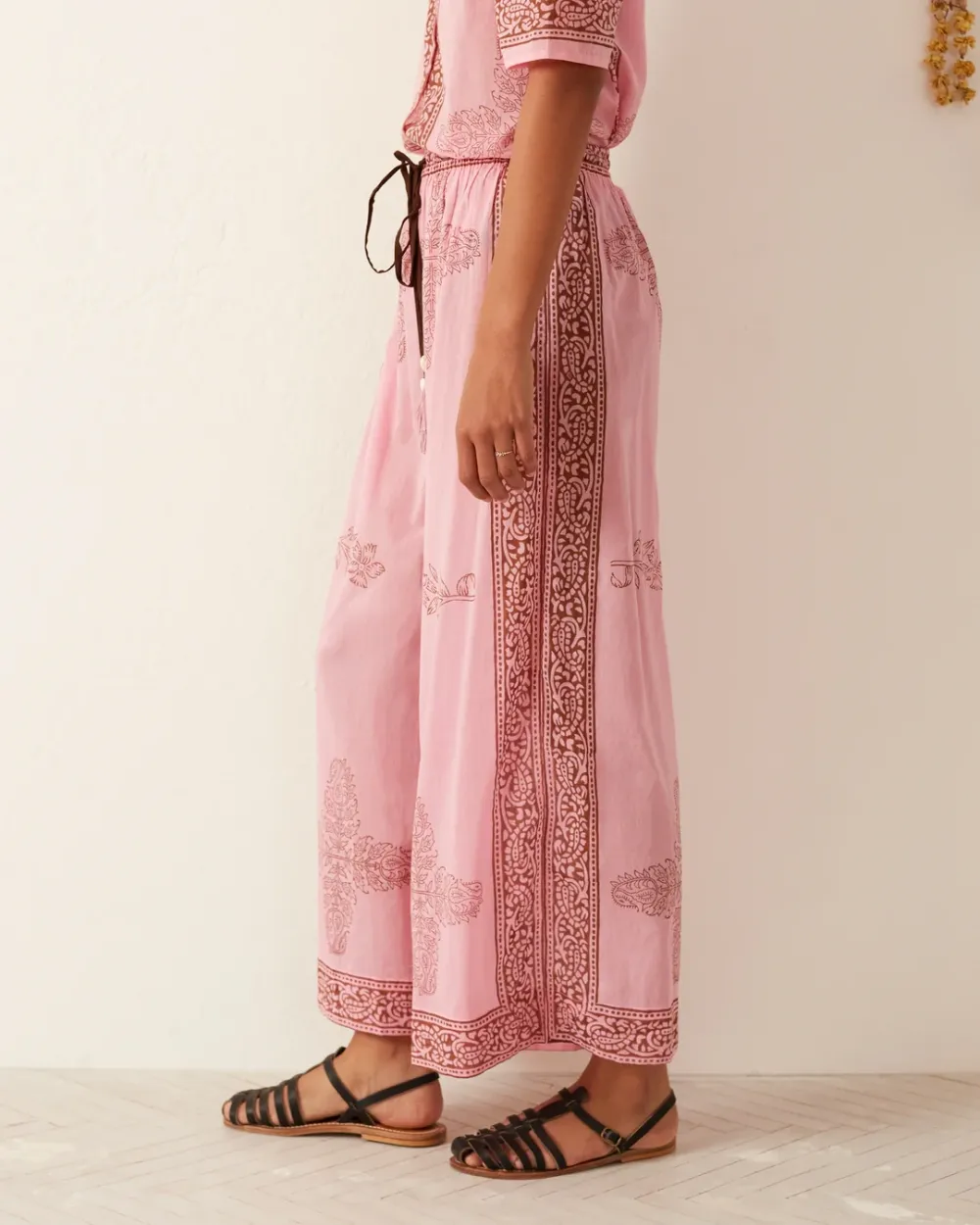 Rendered in block-printed cotton voile, our arabesque print pant has a wide-leg silhouette and an elasticized drawstring waist finished with cowrie shells and tassels. The lightweight pant has a semi-sheer texture that is great for warmer weather.