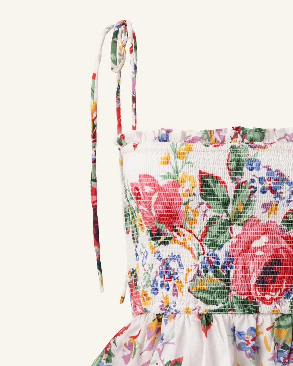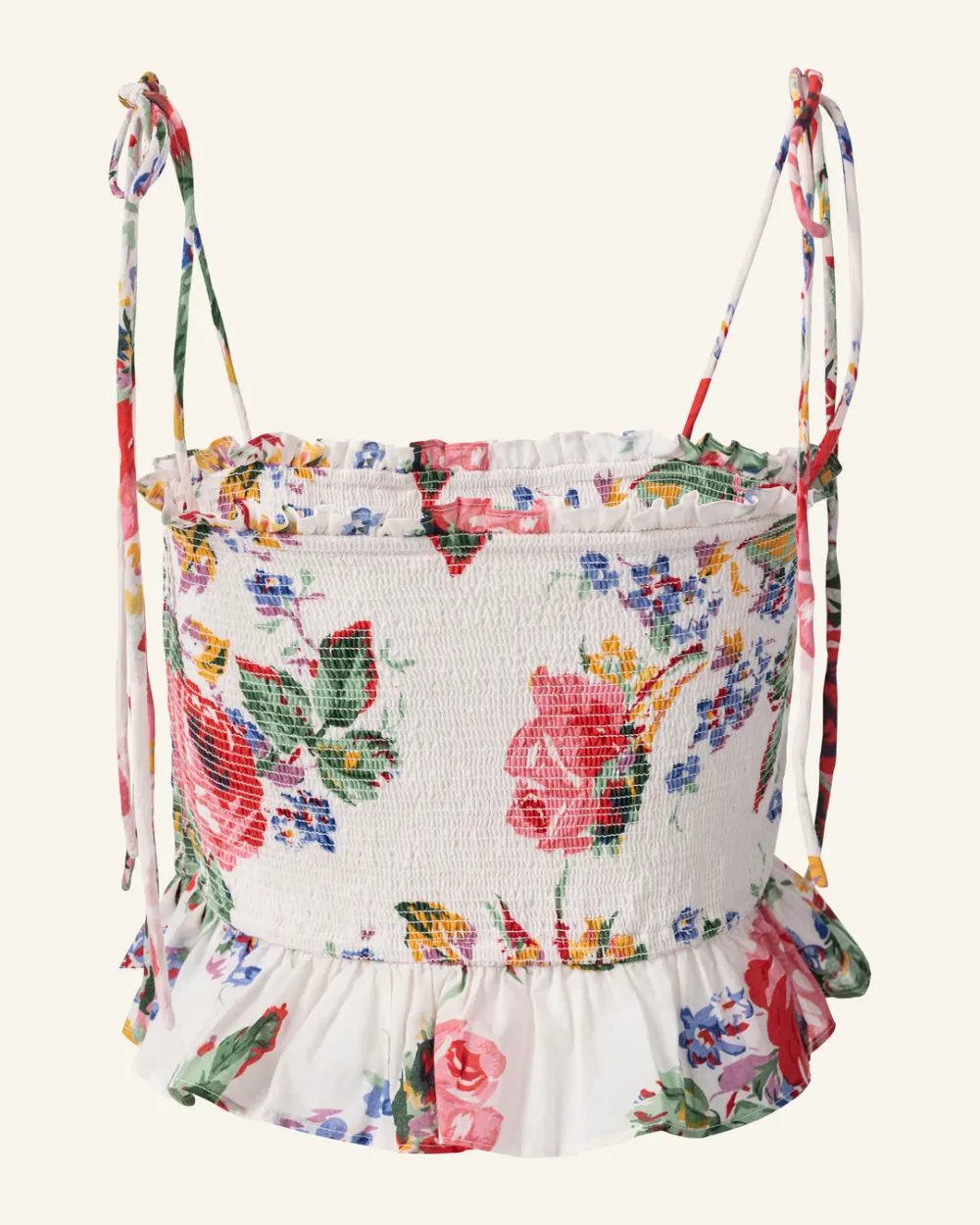 Crafted in block-printed cotton, our floral print top has a smocked bodice. Trimmed in small ruffles with adjustable tie straps, the cropped top can be paired with the matching Tasha Rose Ruffle Skirt.