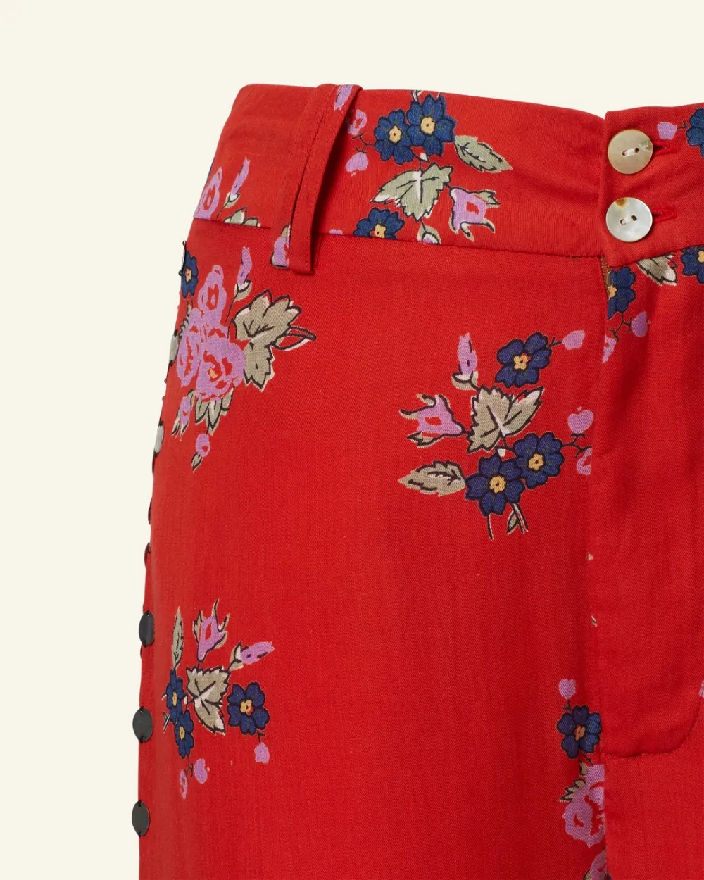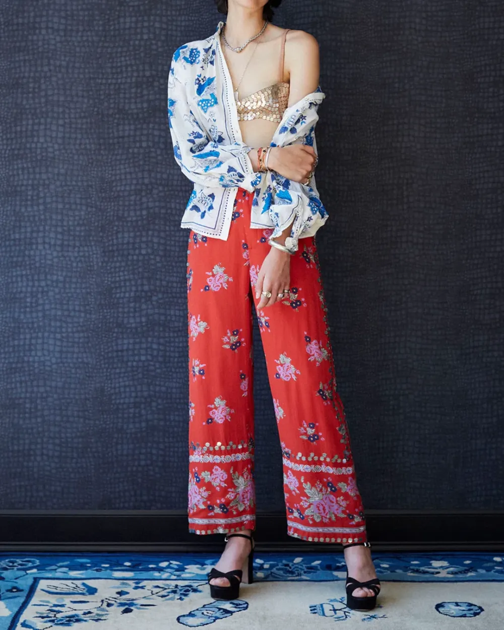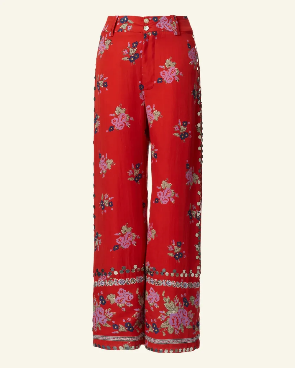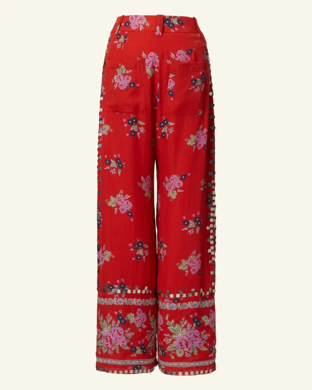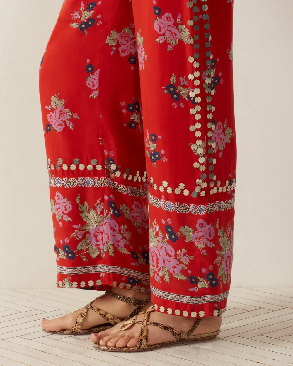 Hand-embellished with silver coins, our red floral print pant has a straight-leg silhouette and zip fly closure. Crafted in Tencel, a soft natural fiber with a beautiful drape, the summery ankle pant features a rose motif inspired by French chintz.