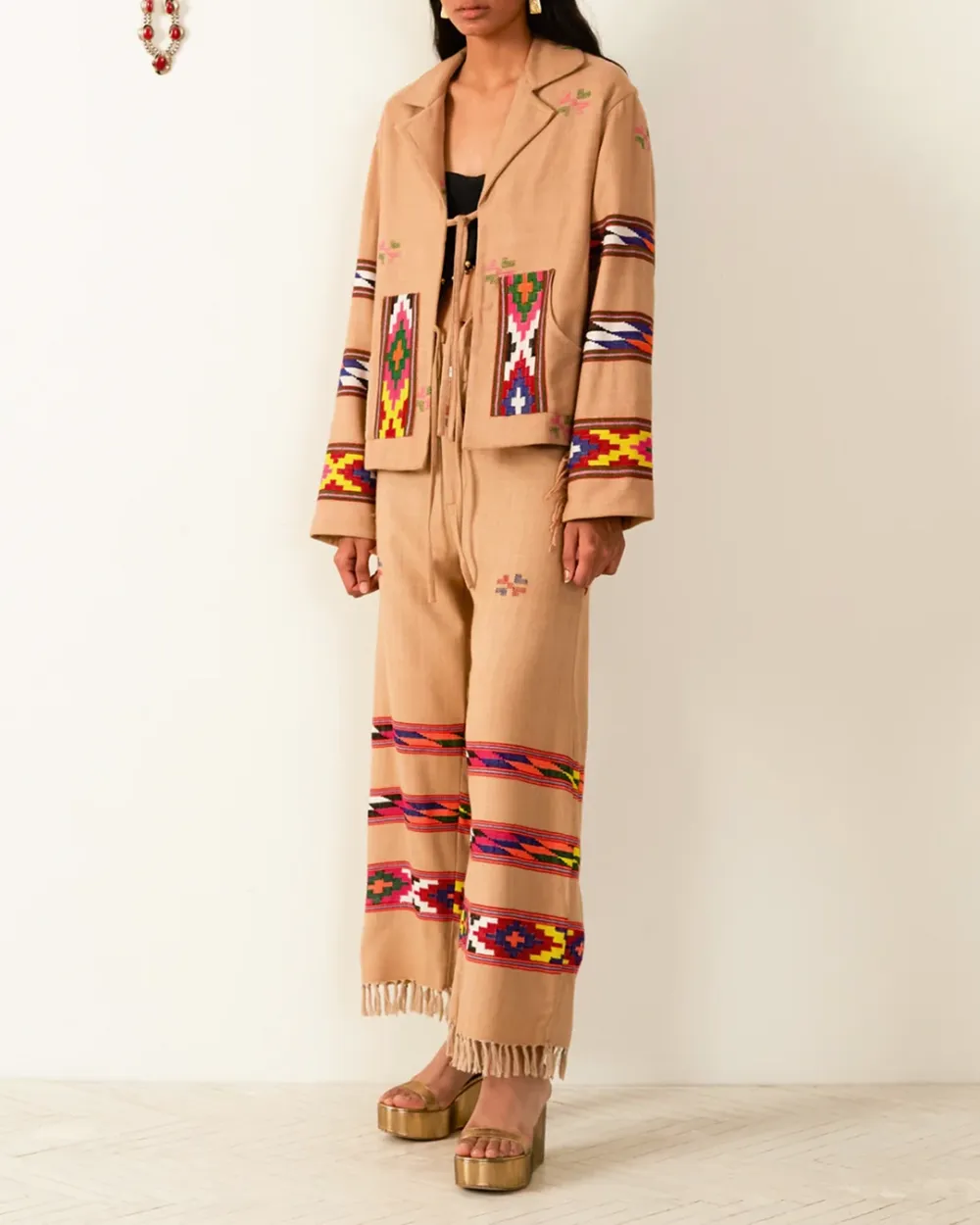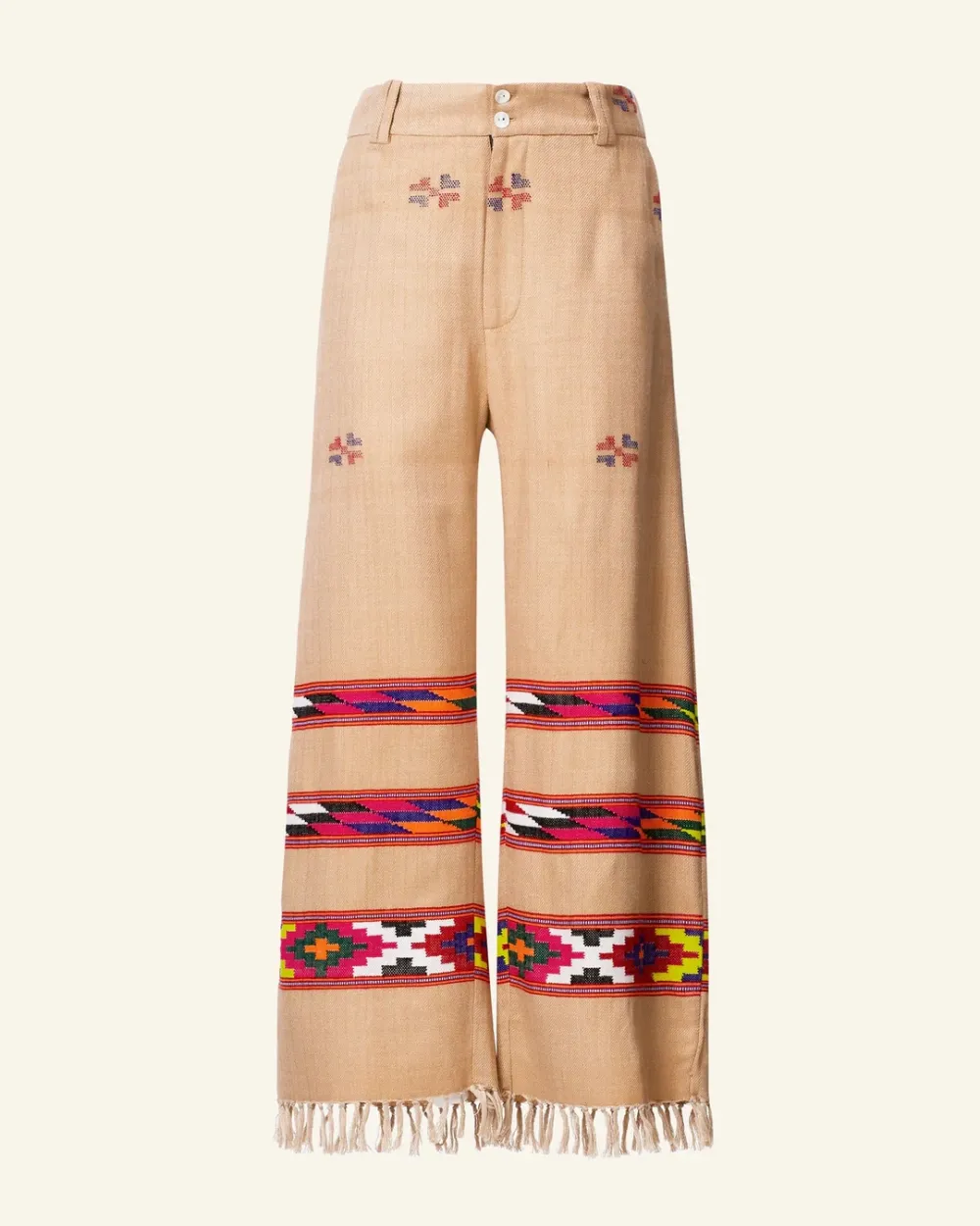Crafted from wool, our tan pant is made from blankets woven by hand in Kullu, a town in the Himalayan foothills with a centuries-old weaving tradition. The straight-leg ankle pant has bands of colorful designs and a fringed hem. Pair the hand-finished pant with the matching Western Dune Blanket Jacket.