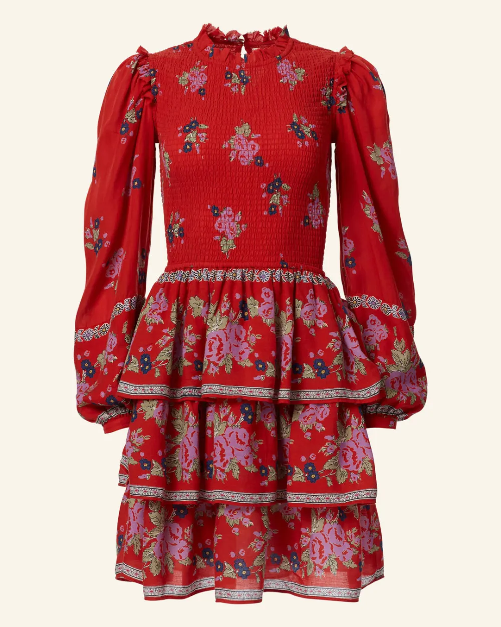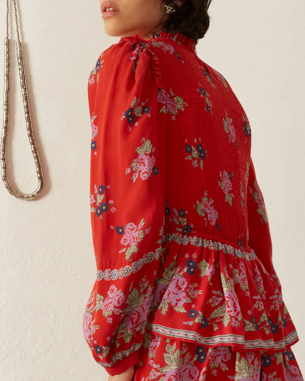 Crafted from Tencel, our red floral mini dress has a smocked bodice and ruffle-tiered skirt. The long-sleeved dres has micro ruffle trim along the neck and armholes. The hand-finished dress features a floral motif inspired by French chintz.