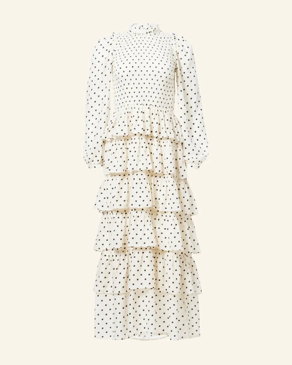 Cut from block-printed Tencel, our polka-dot print white dress has a smocked bodice and a ruffled-tier skirt. The long-sleeved dress has a micro ruffle trim along the neck. The perfect party dress, dress it up or down. Pairs well with a denim jacket.