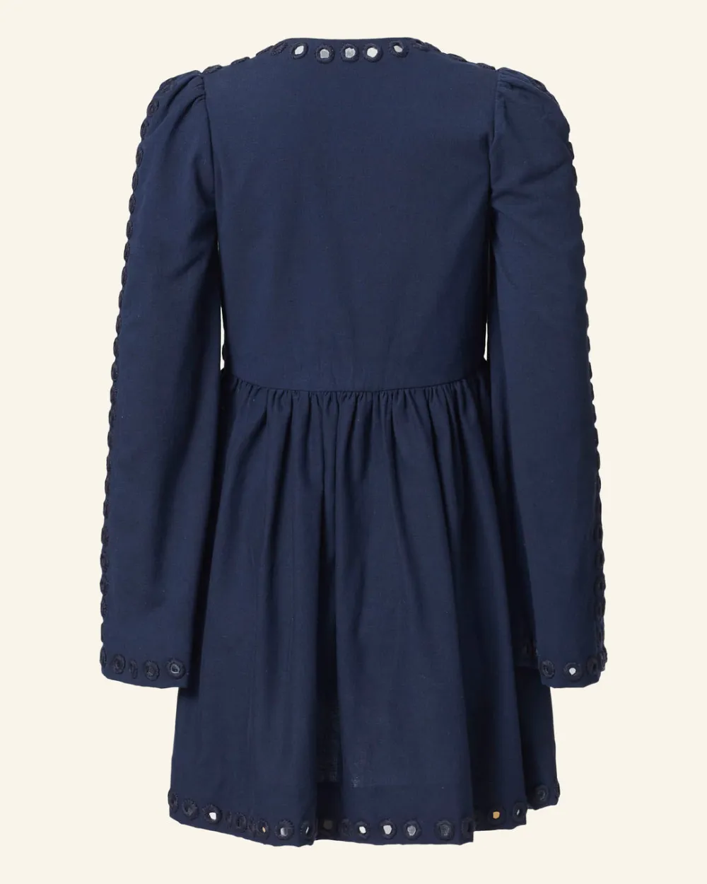 Crafted from Khadi cotton, our blue embellished dress has graceful bell sleeves and a short gathered skirt. The long-sleeved dress is hand-embroidered throughout with mirror work. Mirror work is the ancient craft of hand embroidering mirrors to textiles. The shimmering dress is lined at the bodice and hand finished.