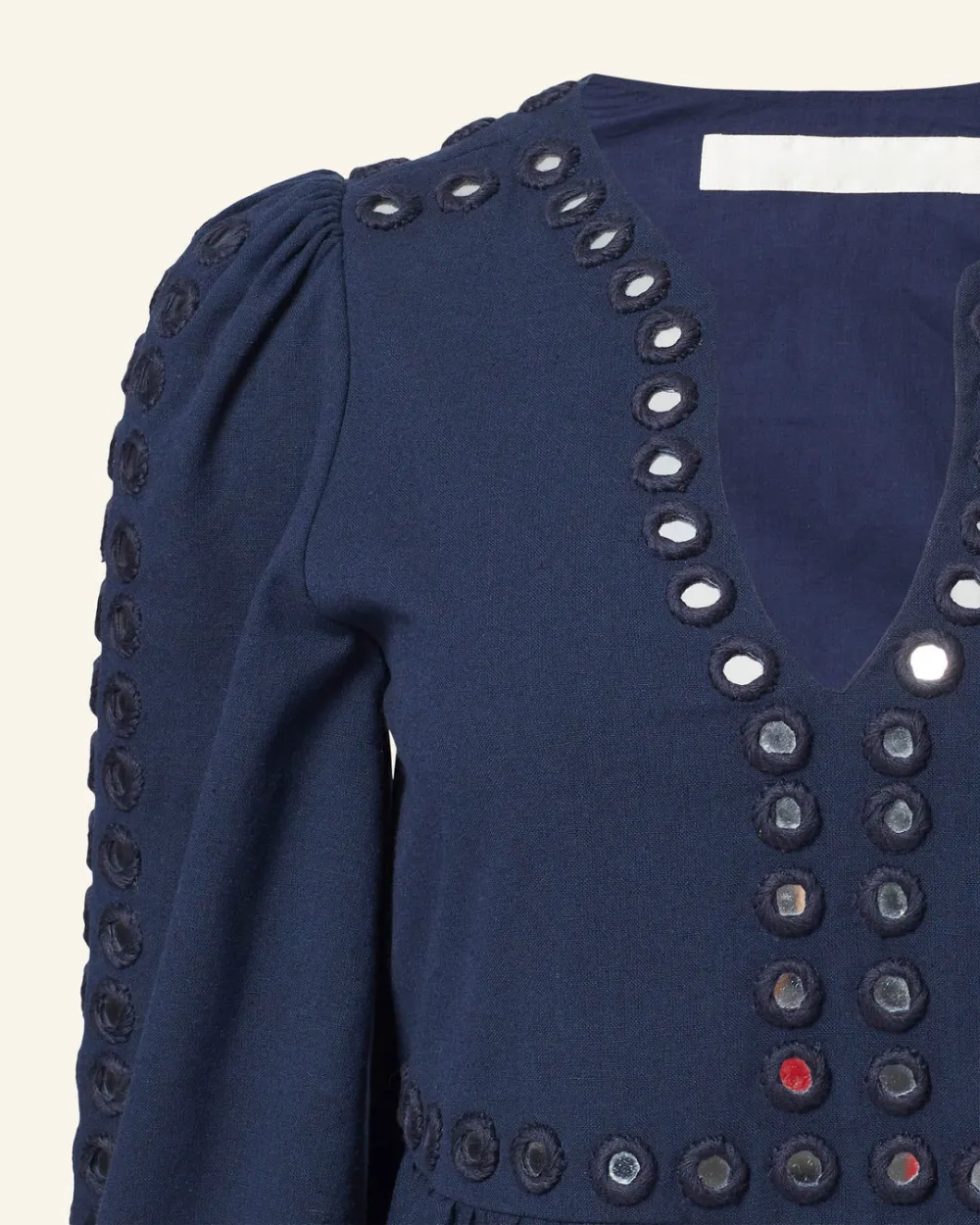 This textile was embroidered by hand. Subtle variations are part of the unique beauty of the garment and a signature of the artisan's hand.