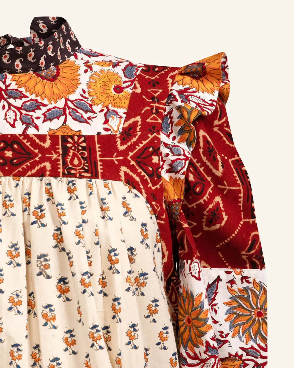 Four hand block printed complimentary textiles are patchworked together to create the Sofia. Gathered at the shoulder and wrist, and finished with a tie at at the back of the neck.