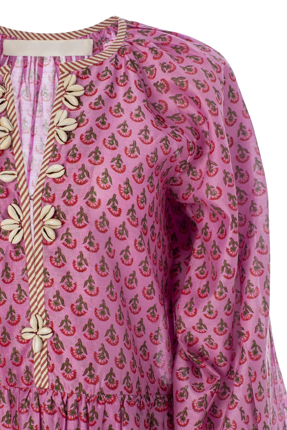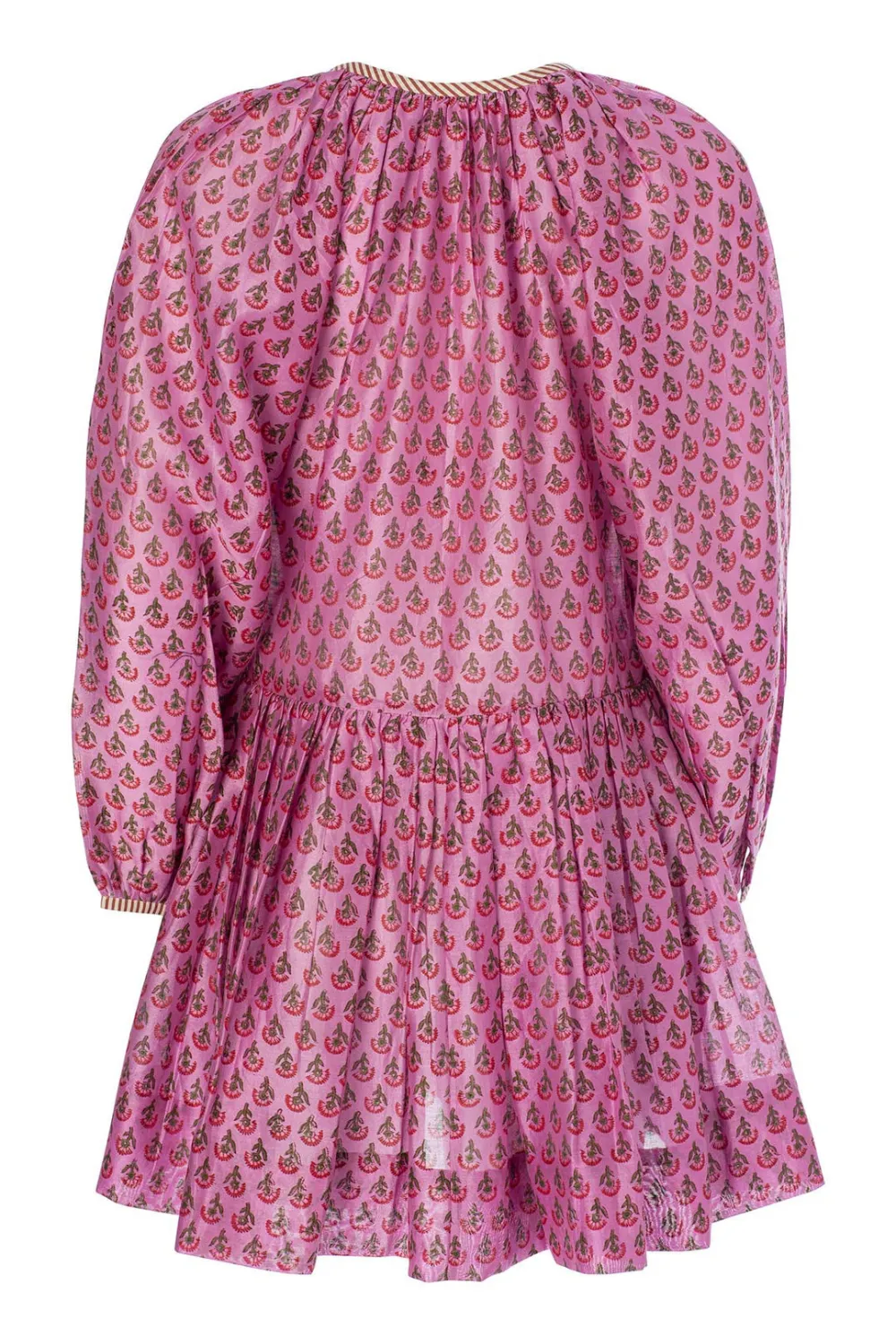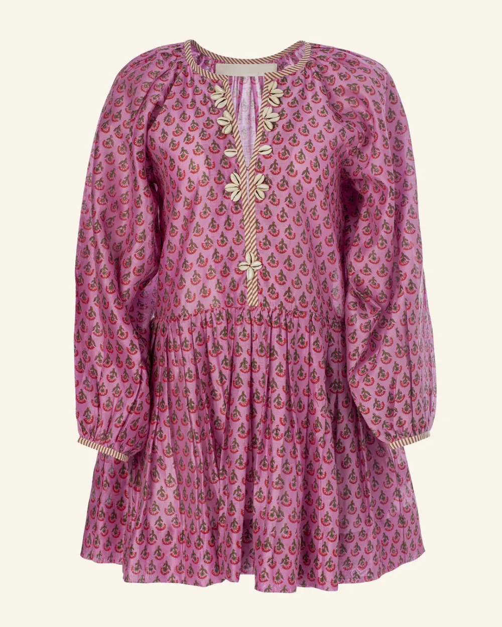 Crafted from hand printed silk cotton, the Sula Dress has a gathered neckline, skirt and sleeves with contrasting binding. Neckline has been hand embellished with cowrie shell accents.
