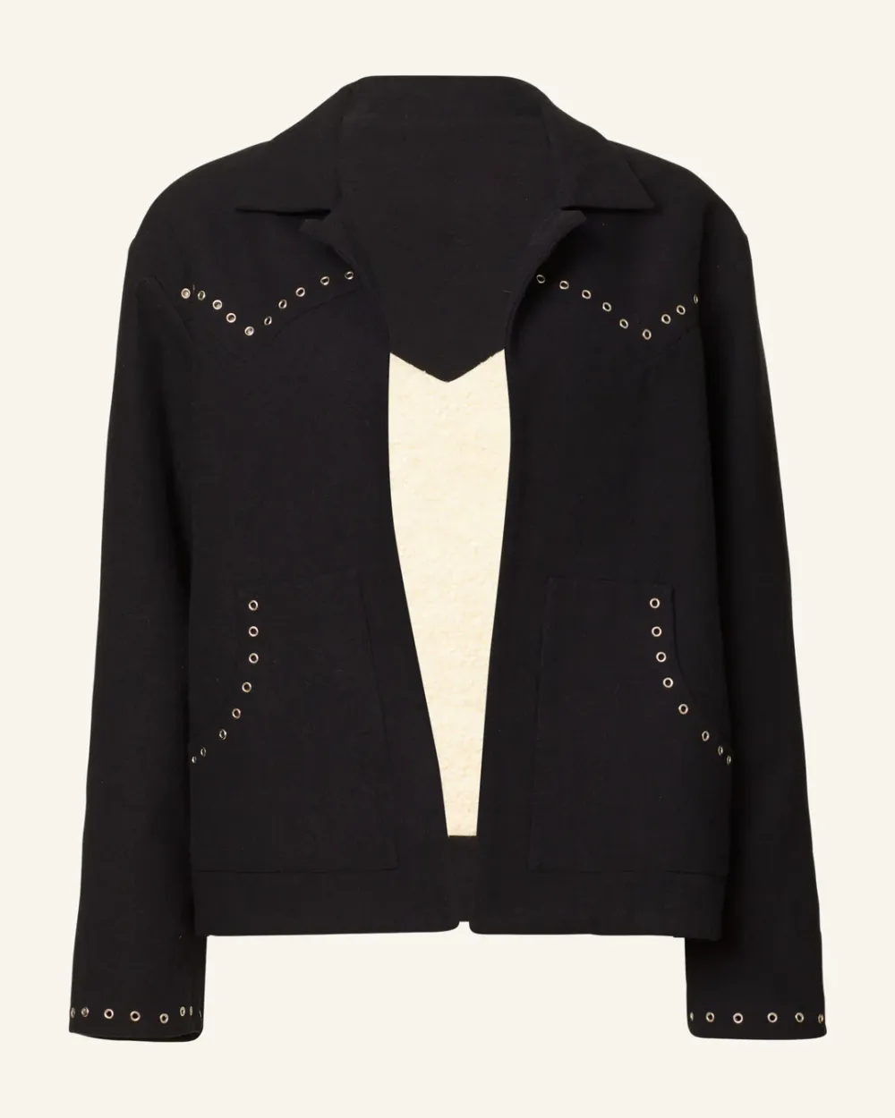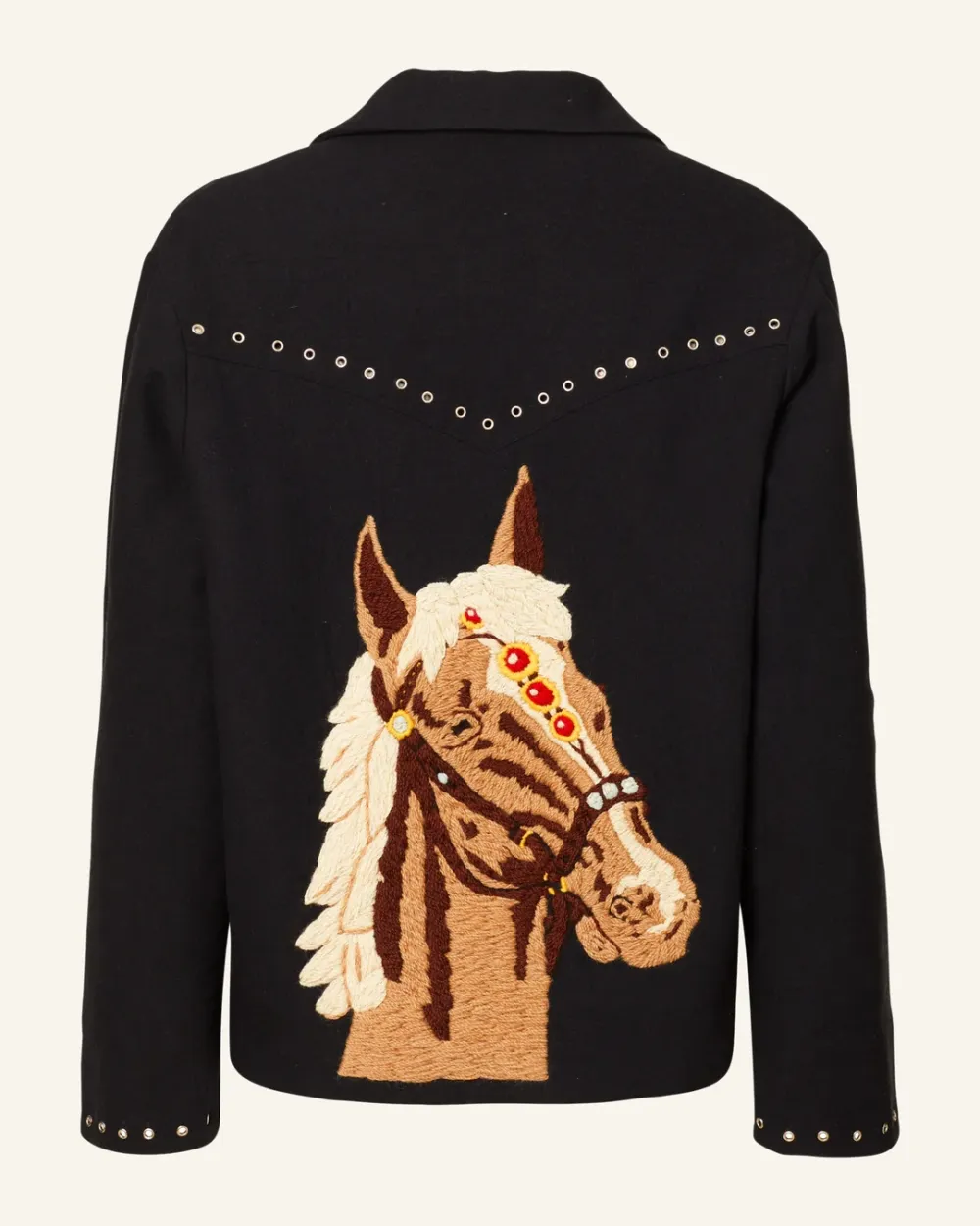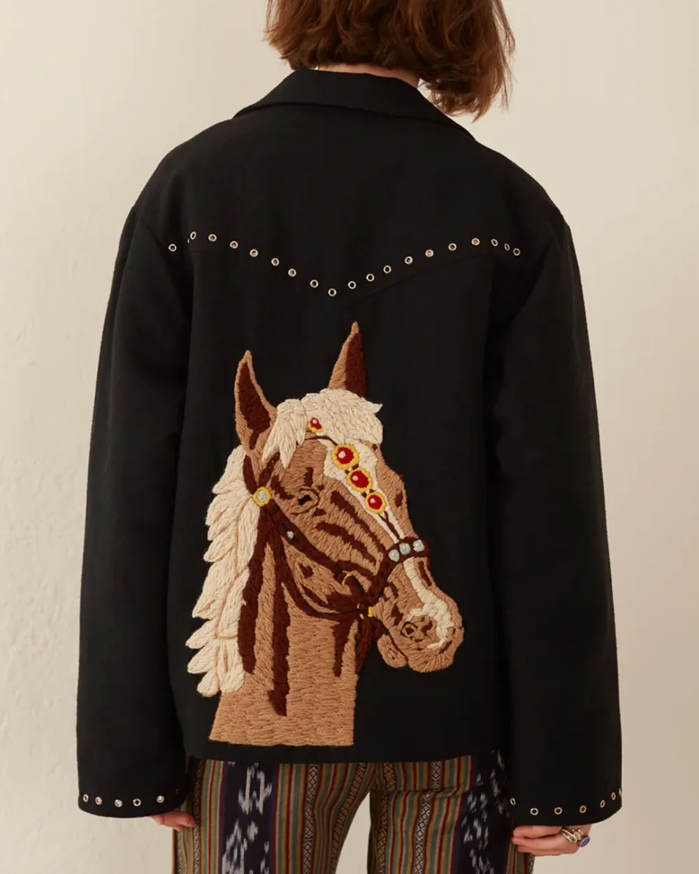 Crafted from Indian slubbed silk, our Western-inspired rodeo jacket is hand-embroidered with a horse motif and lined with metal grommet details. The silk equine jacket has a peak lapel, dropped shoulders, and an easy fit. A great transition piece between seasons.