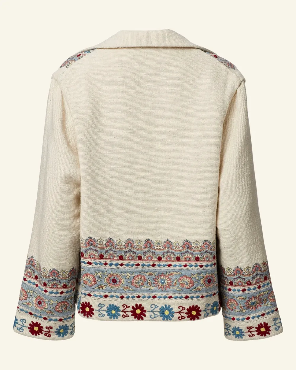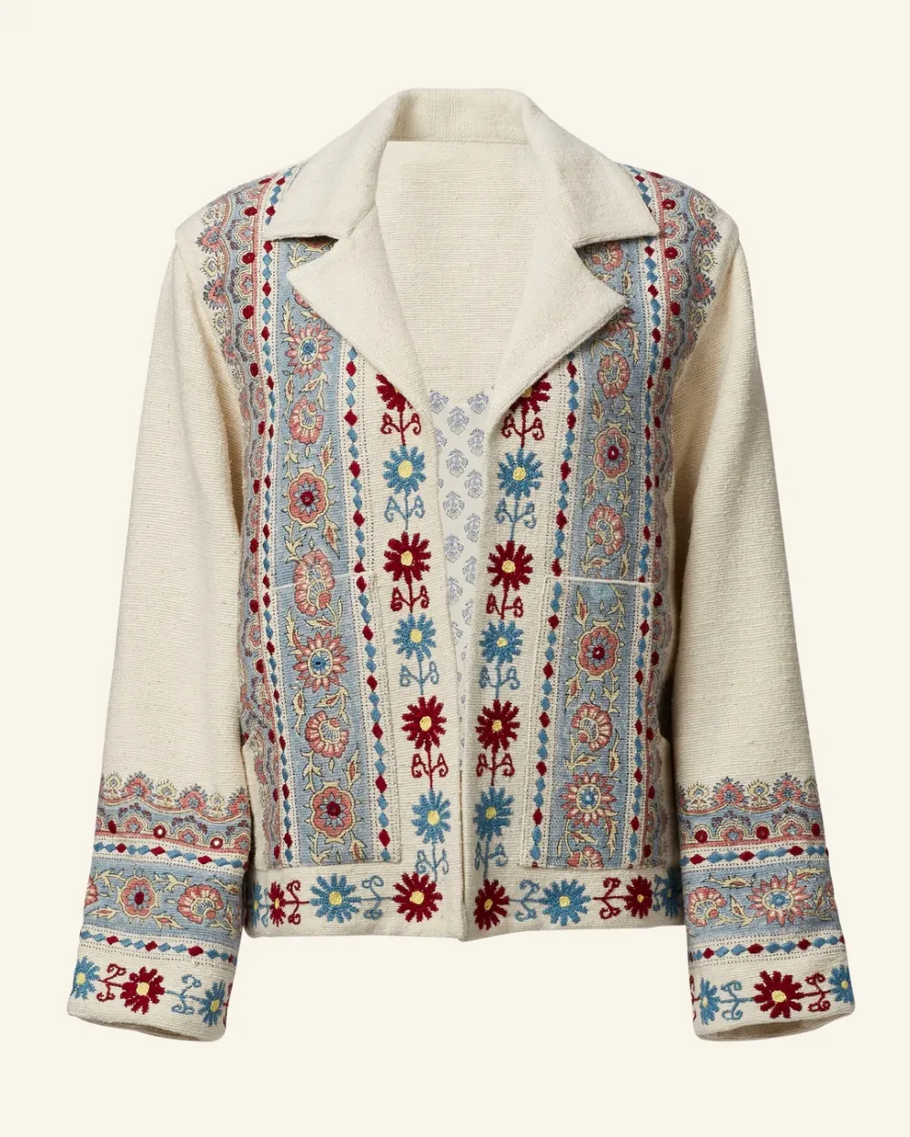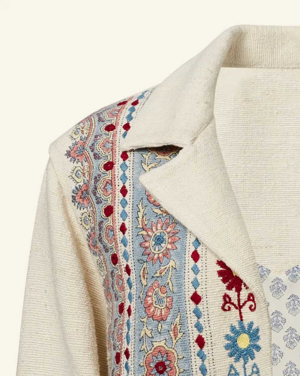 Rendered in hand-loomed silk, our boyfriend jacket is hand-block printed with a border-print motif along the front and cuffs. The silk jacket has dropped shoulders and peak lapel. The folk-inspired jacket is trimmed with hand-embroidered flowers.