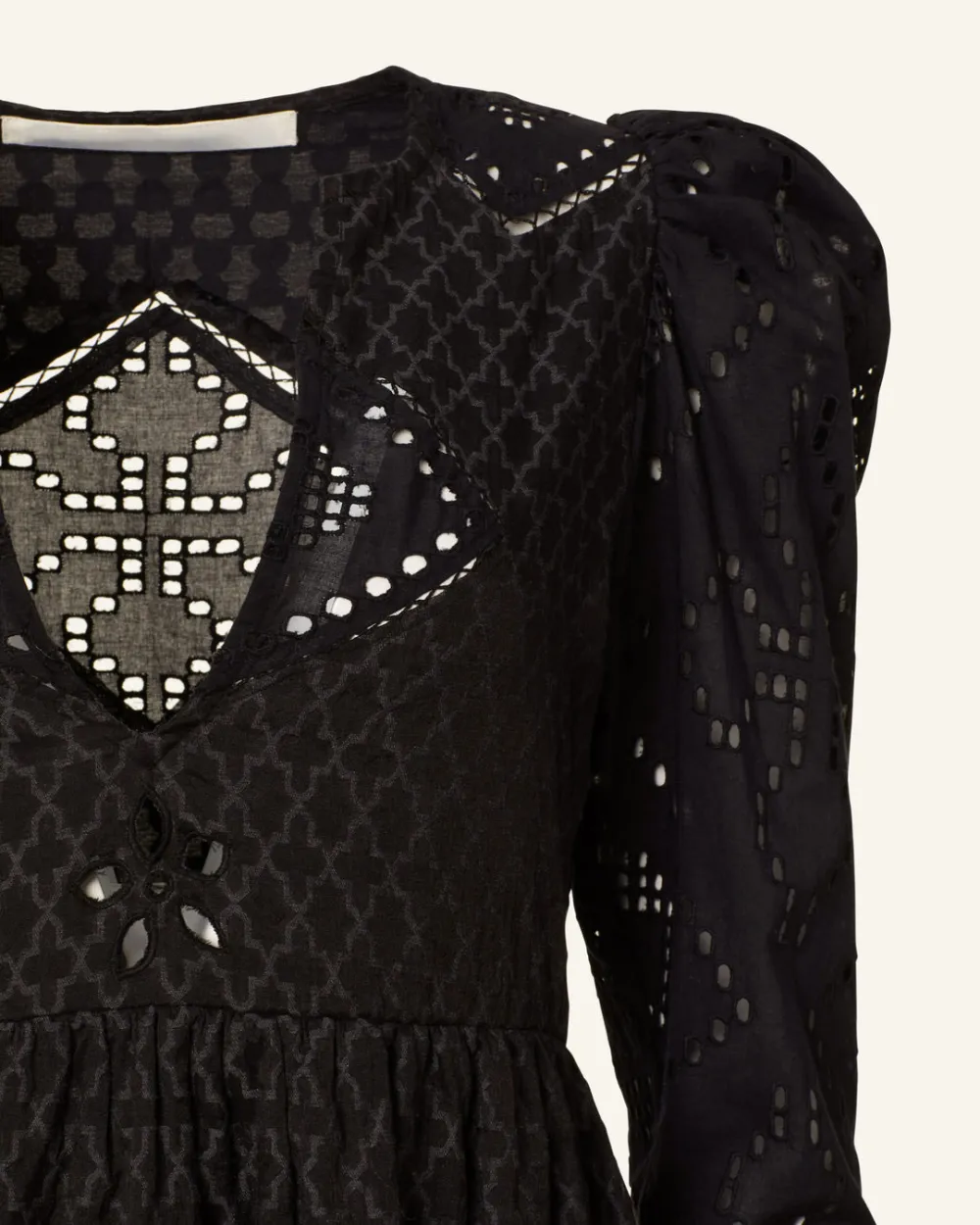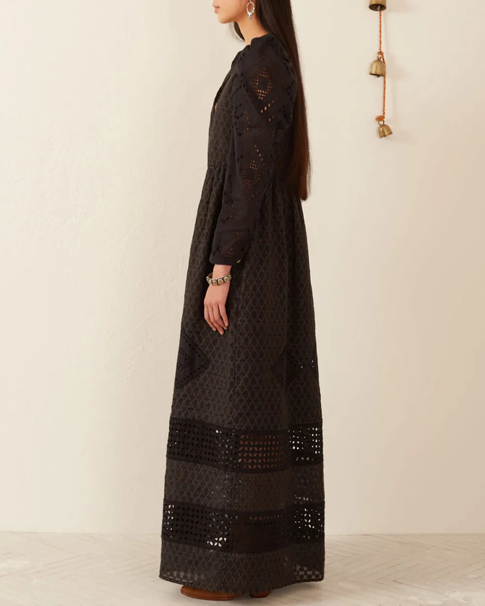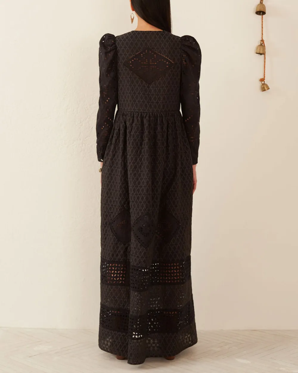 Crafted from cotton eyelet, our hand-embroidered black prairie dress has a romantic silhouette and long sleeves. Eyeleted with diamond-shaped designs, the long dress features hand-stitched fagoting, gathered skirt, and a V-neckline. One of our favorite fits and easy to wear.