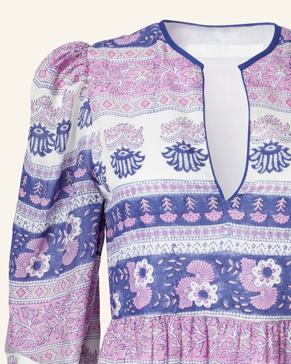 This one-of-a-kind textile was block-printed by hand. Subtle printing and dye variations are part of the unique beauty of the garment and a signature of the artisan’s hand.