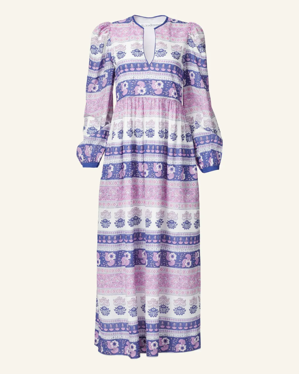 Block-printed by hand, our purple floral print prairie dress has a romantic silhouette and long sleeves. The cotton meadow dress has a V-neckline, long sleeves, and a gathered skirt. One of our favorite fits and easy to wear.